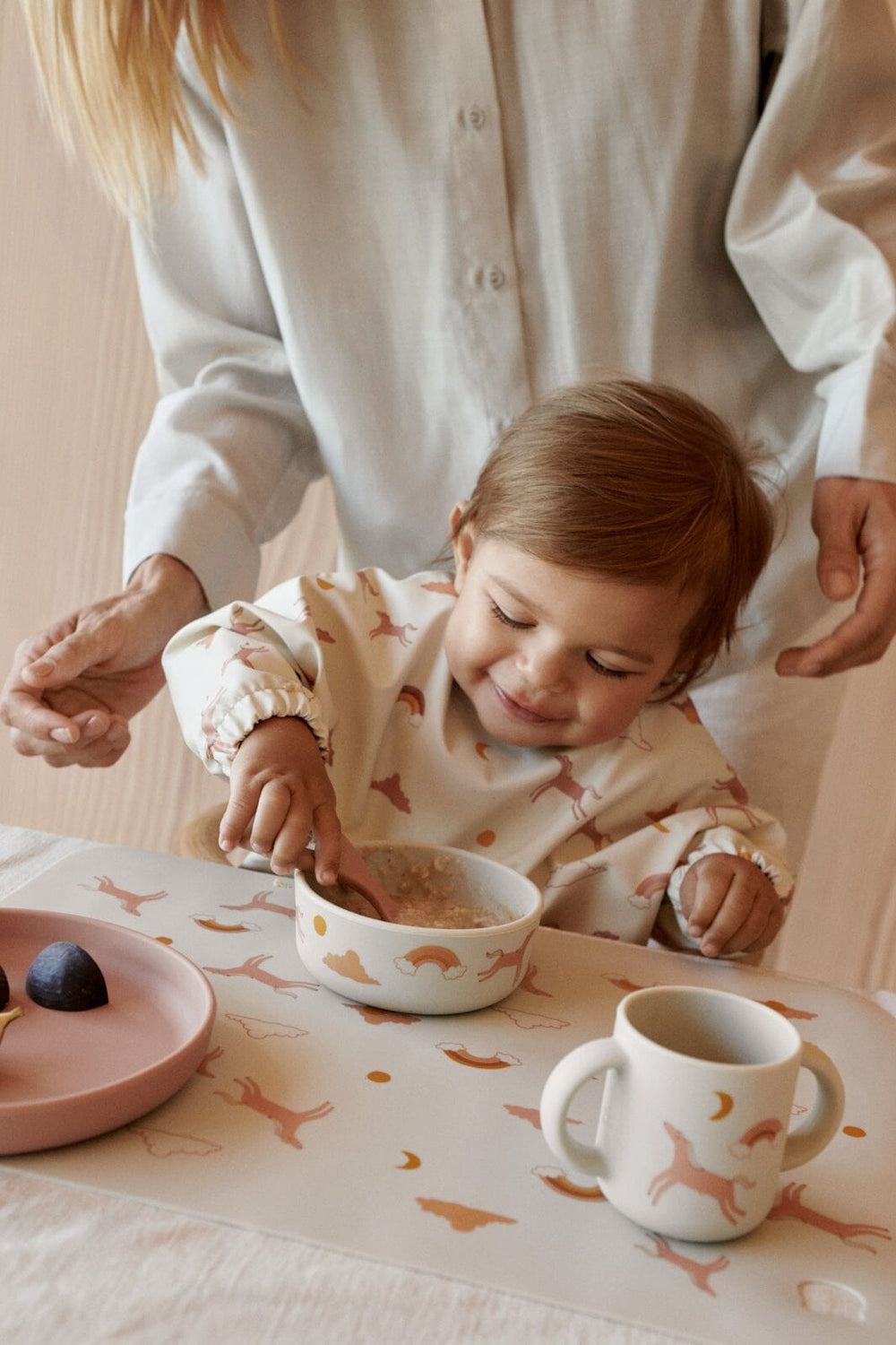 De speciale waterafstotende laag zorgt ervoor dat vocht niet door het materiaal heen dringt. Dit is vooral handig bij het drinken uit een beker of tijdens het voeden met een lepel. Het oppervlak houdt vloeistoffen tegen, waardoor de kleding droog blijft tijdens de hele maaltijd.