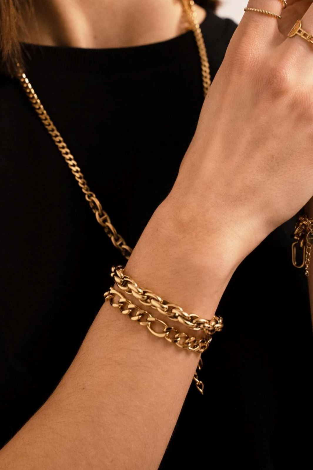 - Kies een opvallende armband als basis en voeg daar dunne armbandjes aan toe