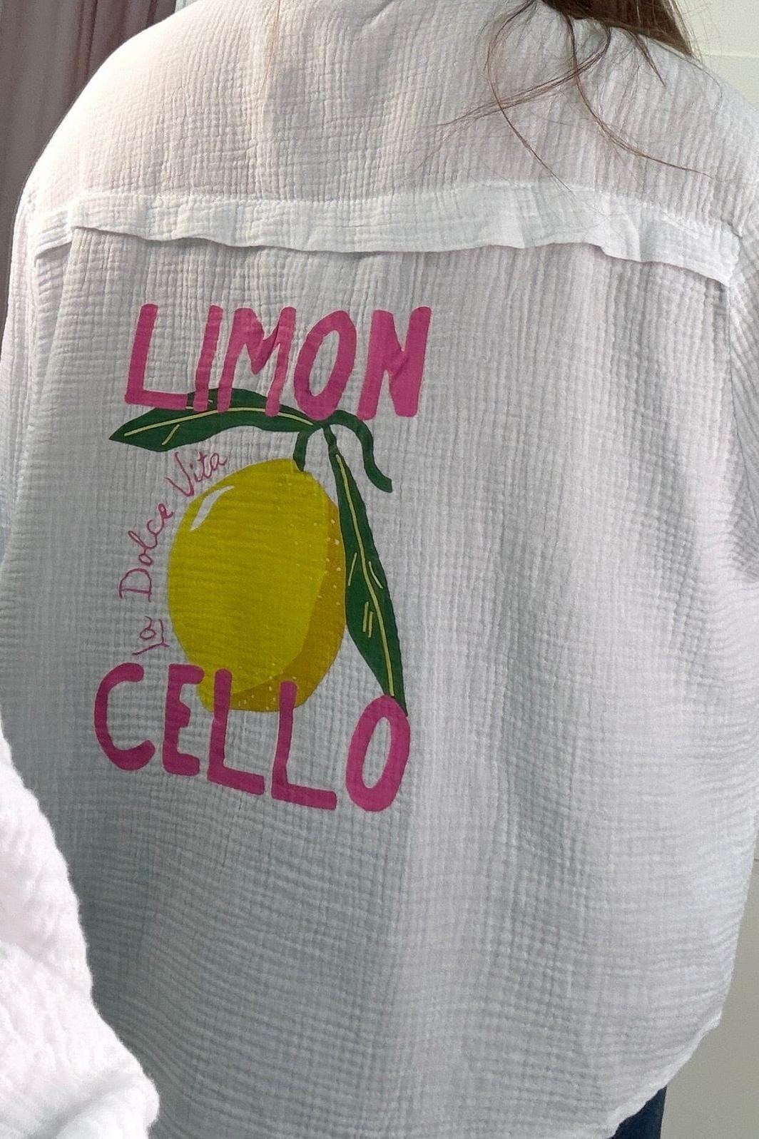 Witte blouse van A-bee van 100% katoen met een limoncello-print op de rug. De blouse heeft lange mouwen en een klassieke kraag.