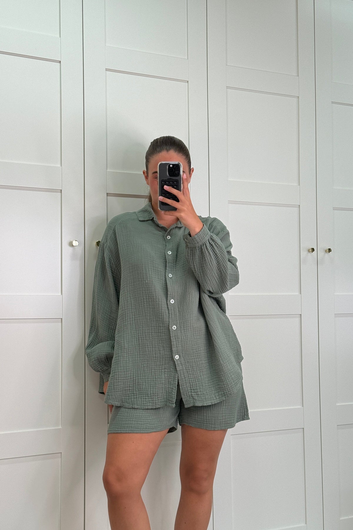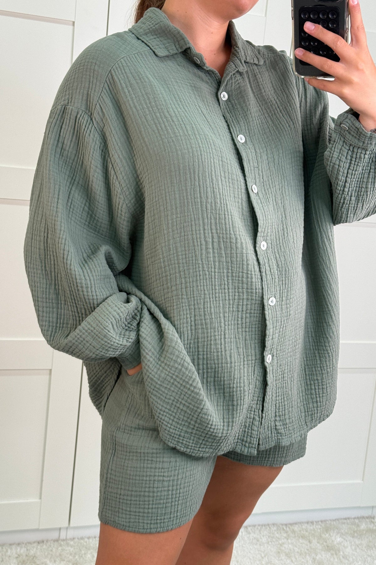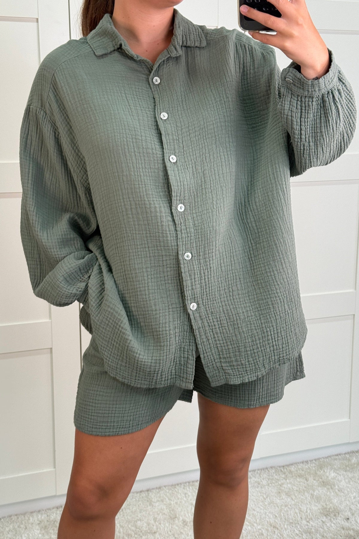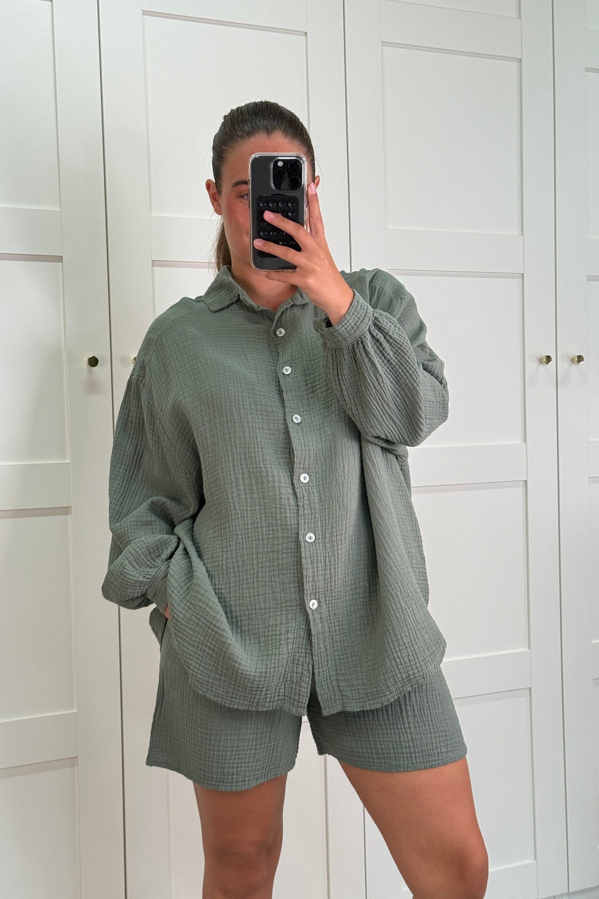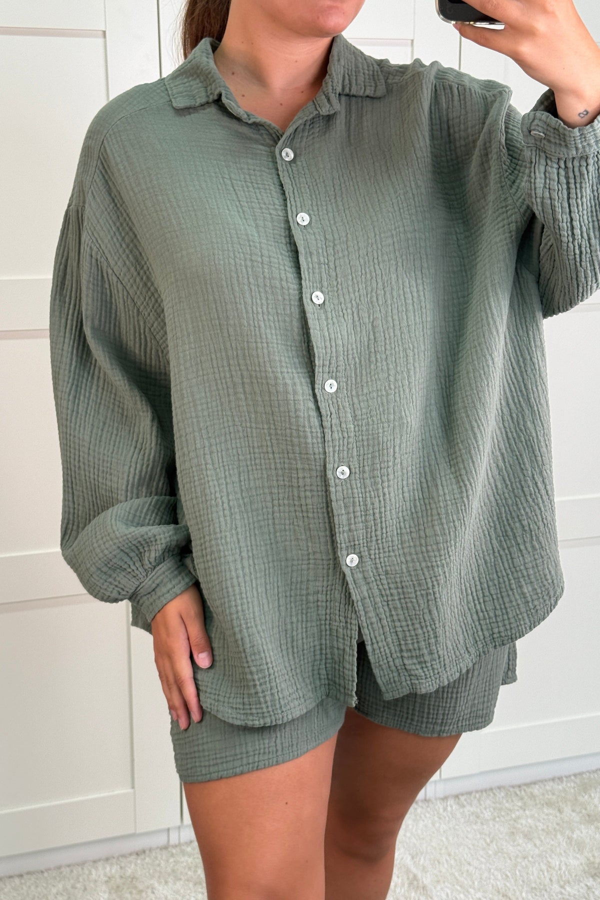 Kaki groene blouse van A-bee in lichte katoenkwaliteit. De blouse heeft knopen tot beneden en een bindband in de taille. De groene tint past goed bij zowel lichte als donkere kleuren.