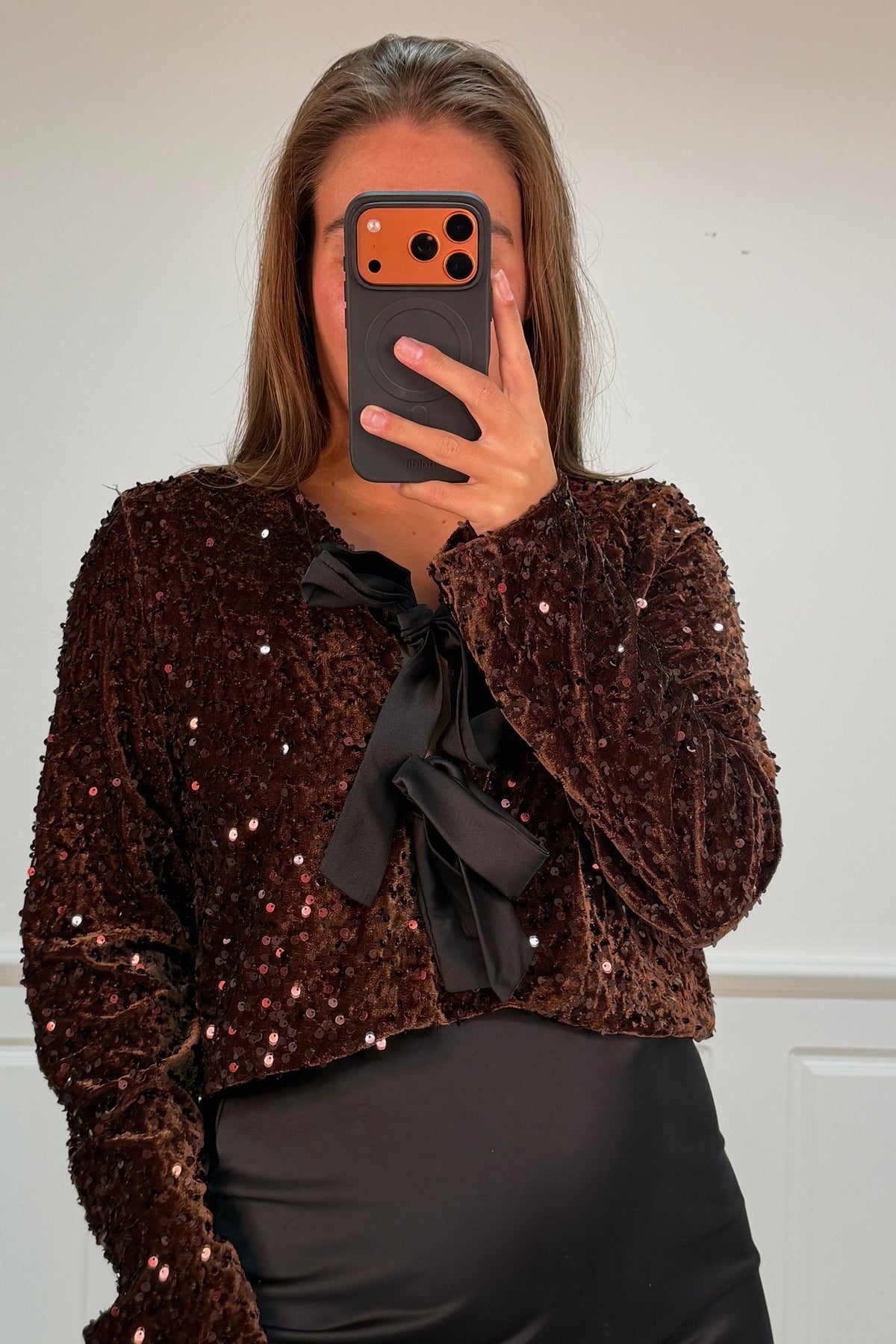 Donker maroon blouse van A-bee met glanzende pailletten overal. Het heeft een zwarte strik bij de V-hals en lange mouwen met een losse pasvorm.