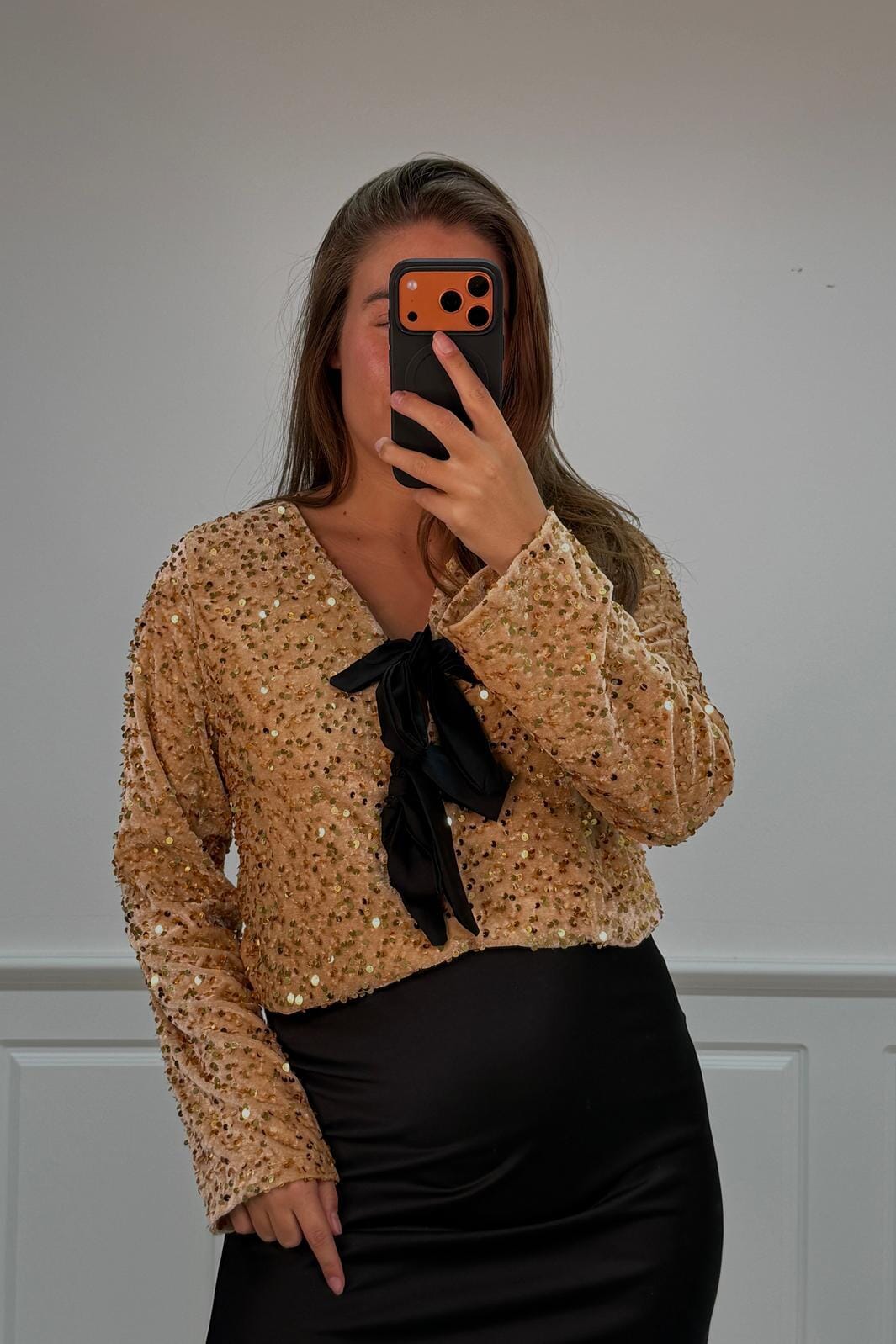 Gouden blouse van A-bee met pailletten over het hele oppervlak. Het heeft lange mouwen, een V-hals en zwarte strikdetails bij de hals.