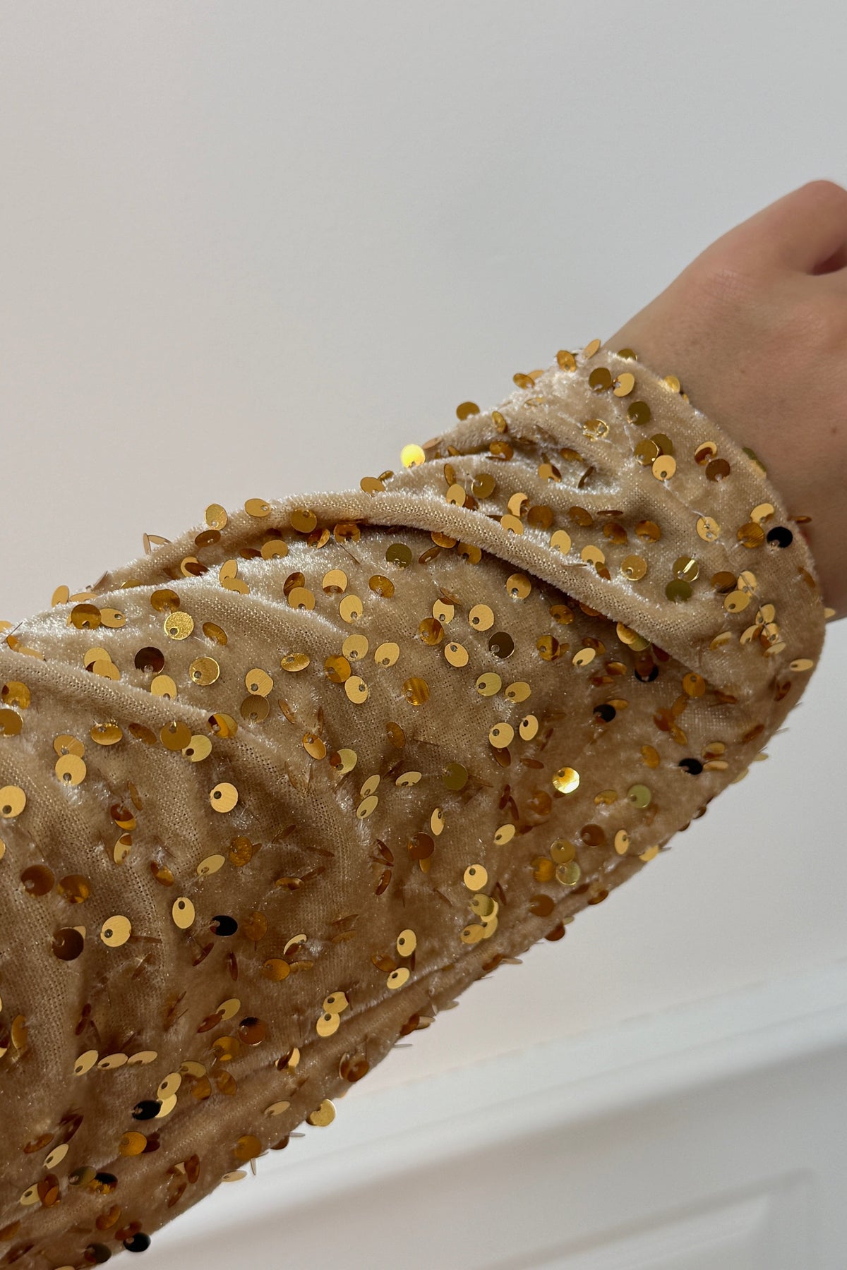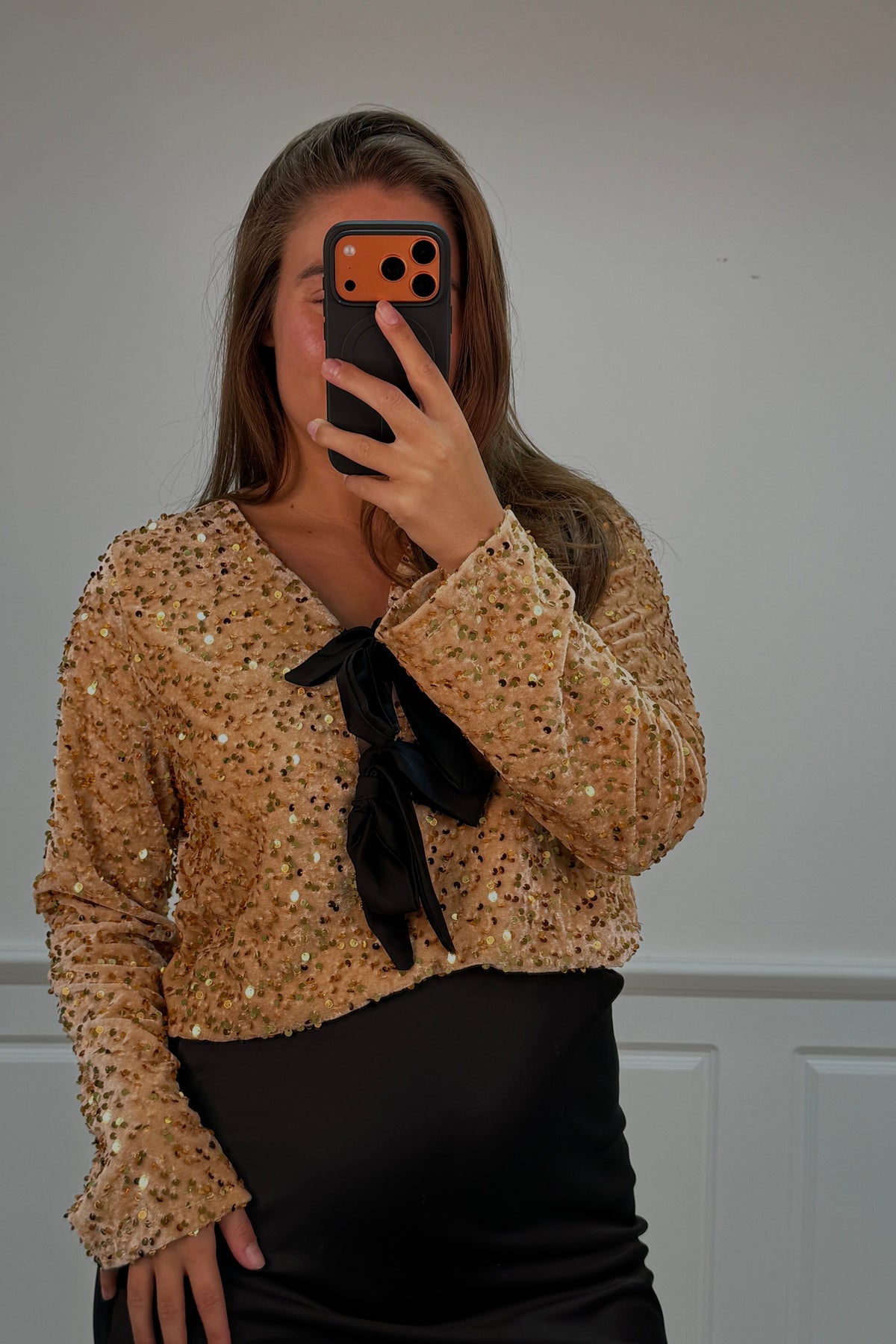 Gouden blouse van A-bee met pailletten over het hele oppervlak. Het heeft lange mouwen, een V-hals en zwarte strikdetails bij de hals.