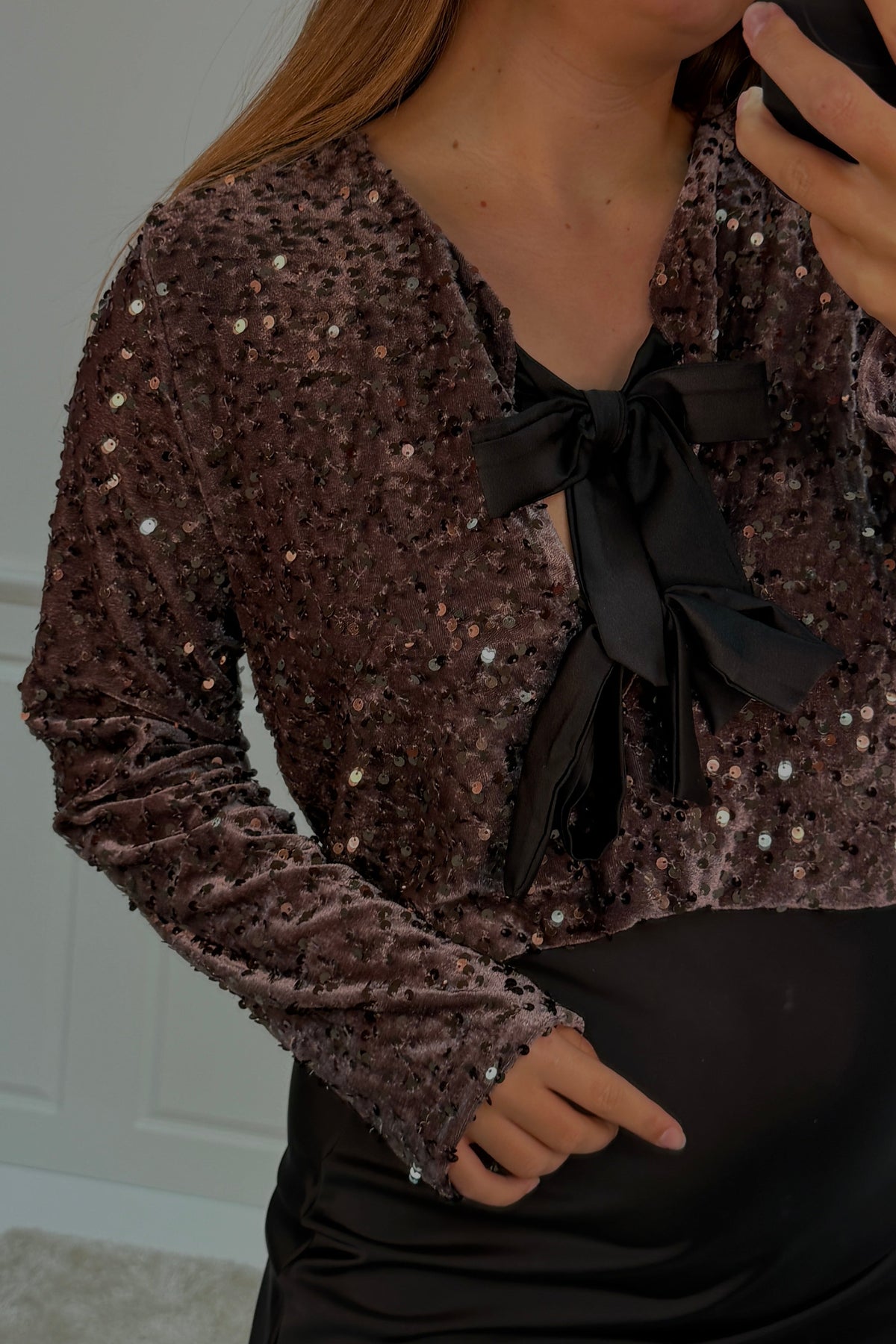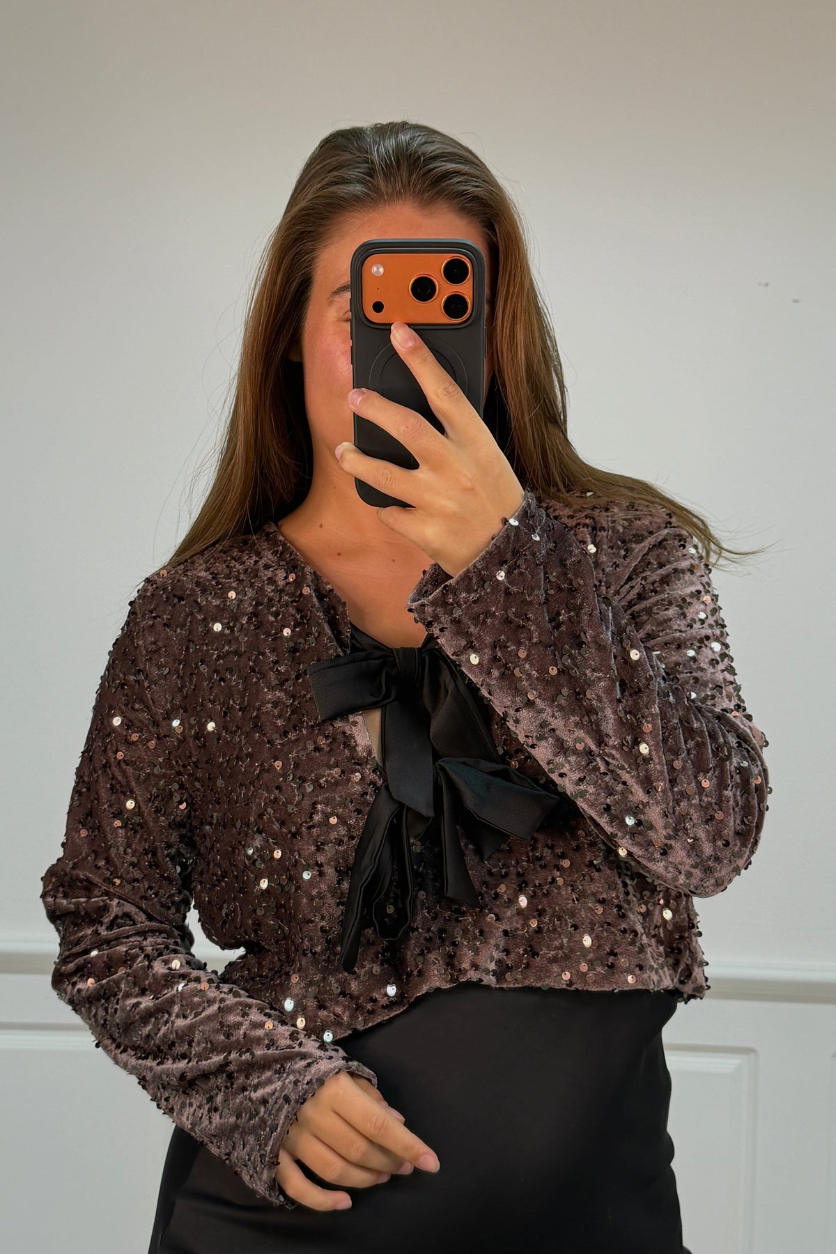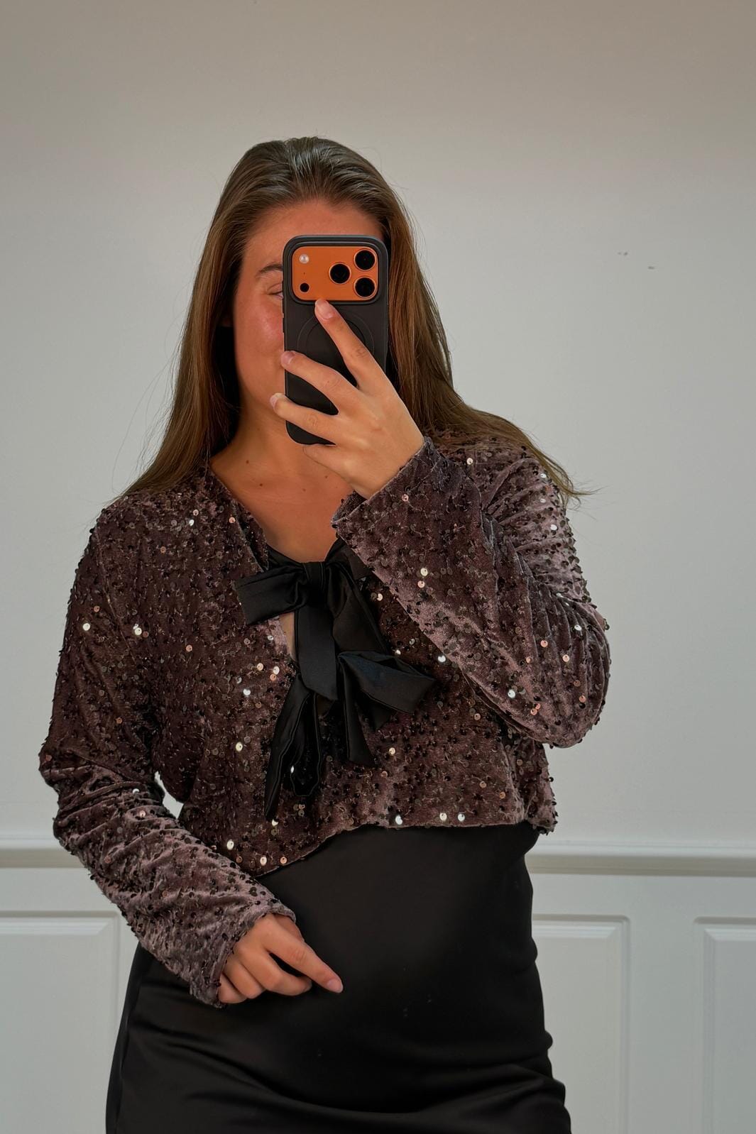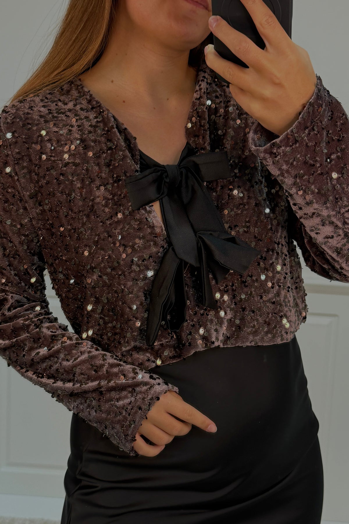 Feestblouse van A-bee in licht maroon met pailletten over de hele stof. Een V-hals met zwarte strik en lange mouwen geeft de blouse een feestelijk tintje.