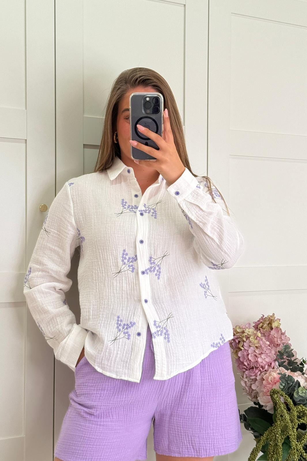 Witte blouse van A-bee met paarse bloemenborduursel. De blouse heeft een losse pasvorm en lange mouwen met een klassieke kraag en knoopsluiting aan de voorkant.