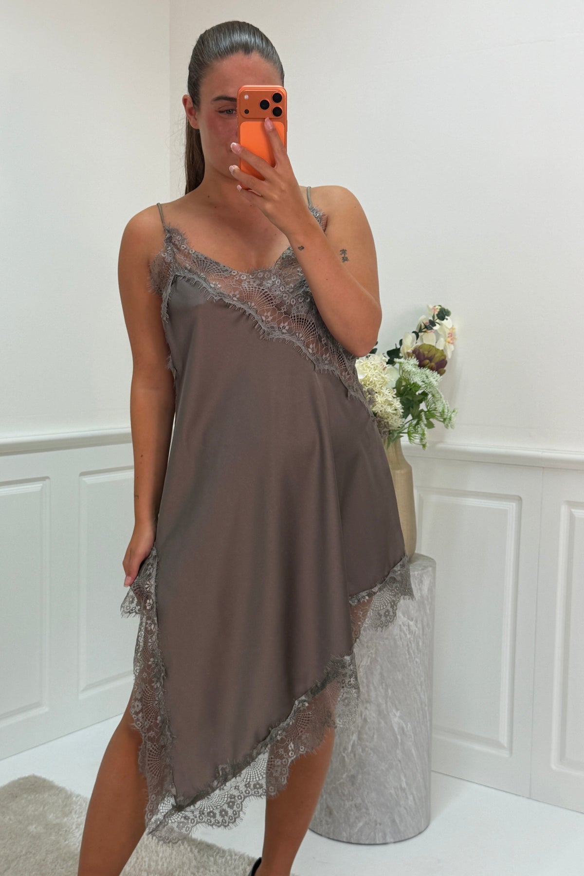 Knielange jurk van A-bee in bruin-grijze tint. De jurk heeft een asymmetrische rand met kantdetails en dunne bandjes. De V-hals en losse pasvorm maken het geschikt voor feestelijke gelegenheden.