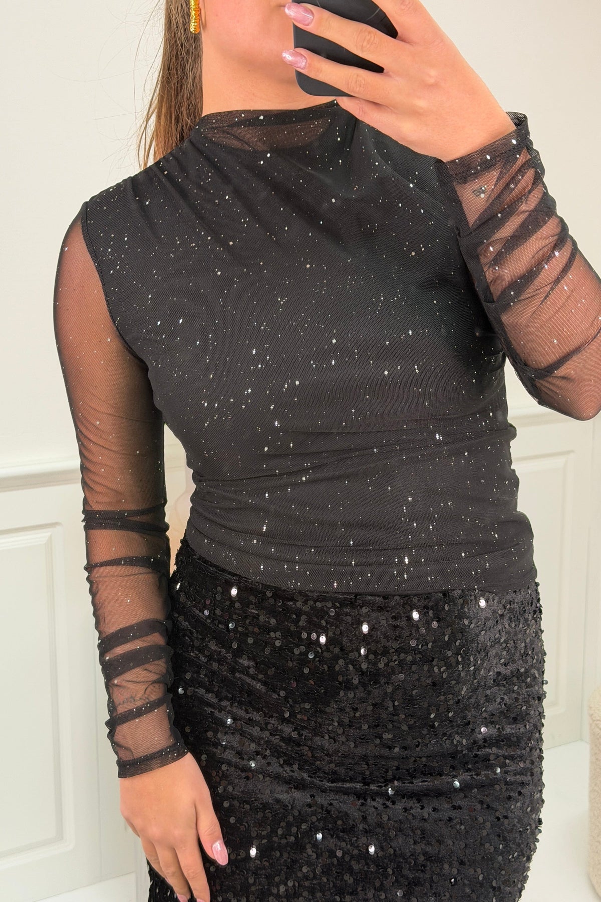 Zwarte blouse van A-bee met pailletten op de stof. De blouse heeft transparante mesh-mouwen en een geplooid design, waardoor deze geschikt is voor feestelijke gelegenheden.