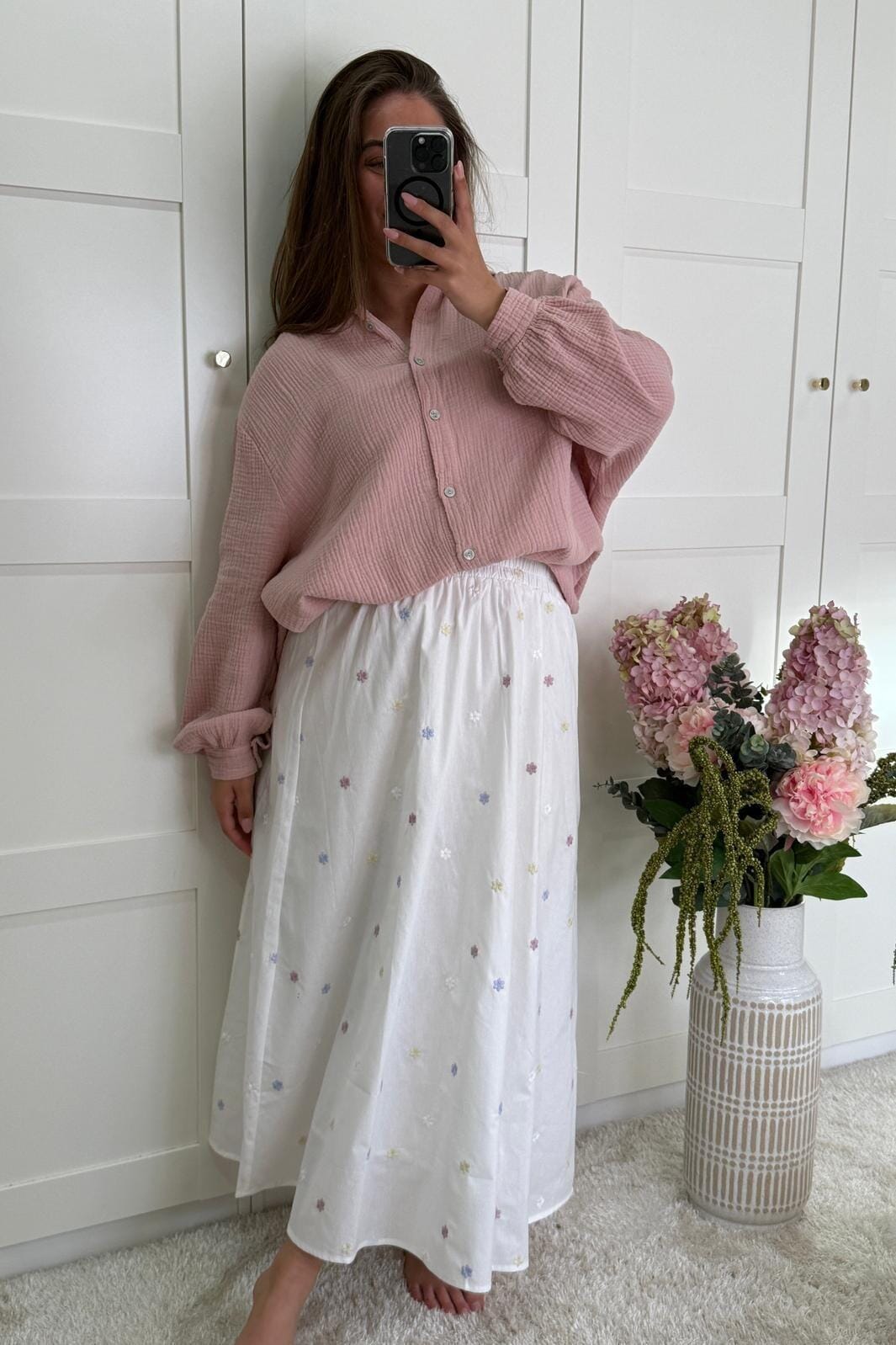 Witte rok van A-bee met geborduurde bloemen in paars, geel en roze. Hij heeft een losse pasvorm en knielengte, waardoor hij zowel voor dagelijks gebruik als voor feesten geschikt is.