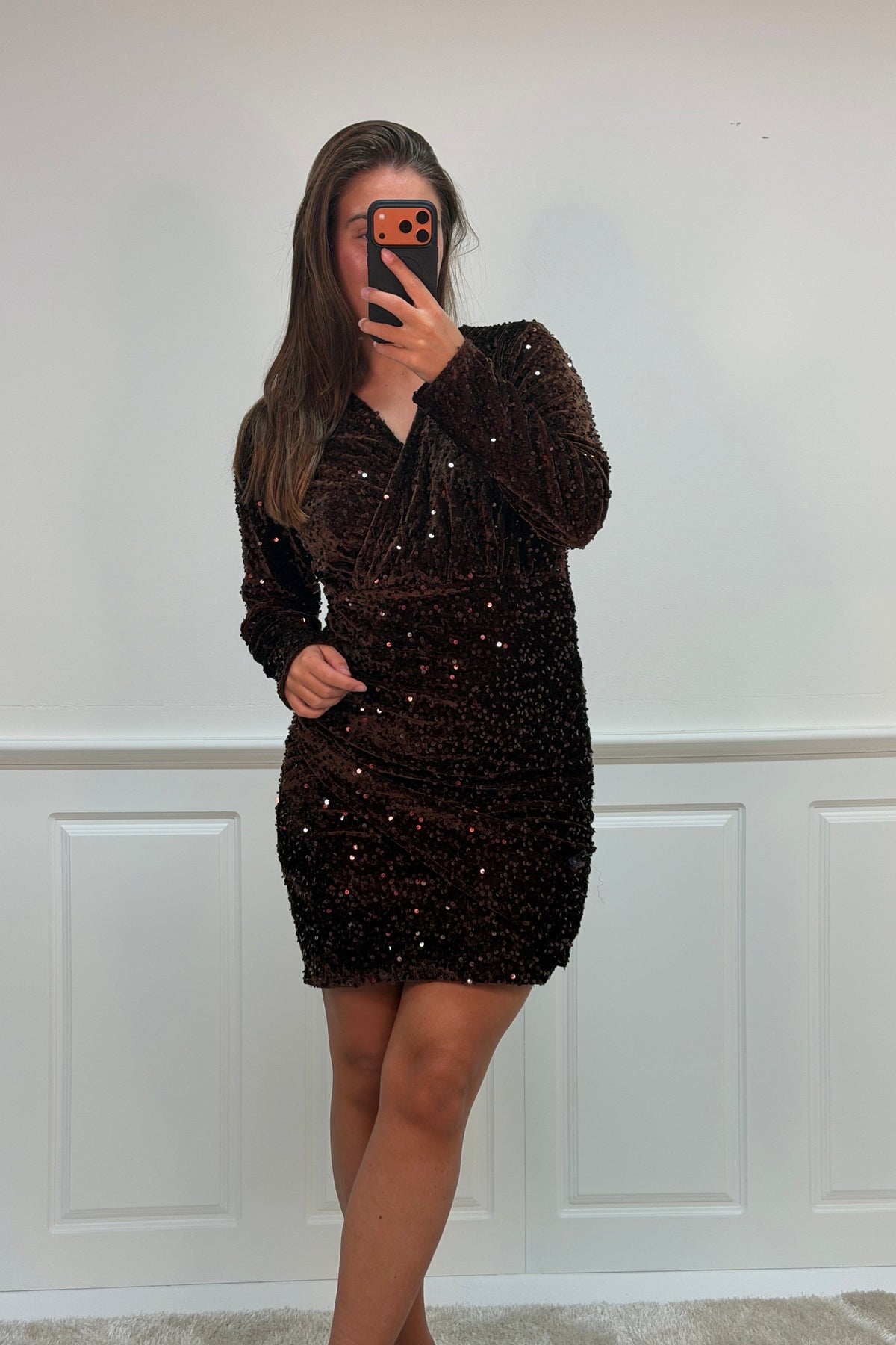 Donkerbruin jurk van A-bee met pailletten over het hele oppervlak. De jurk heeft een aansluitende pasvorm en komt tot halverwege het bovenbeen.
