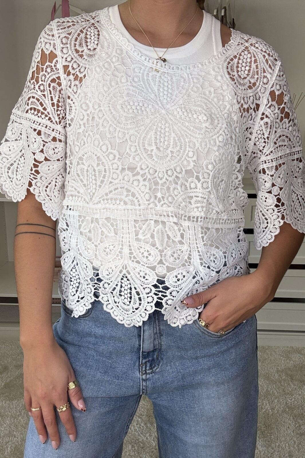 Witte t-shirt van A-bee met bloemenpatroon over het hele ontwerp. De t-shirt heeft een ronde halslijn en 3/4-lange mouwen met kant.