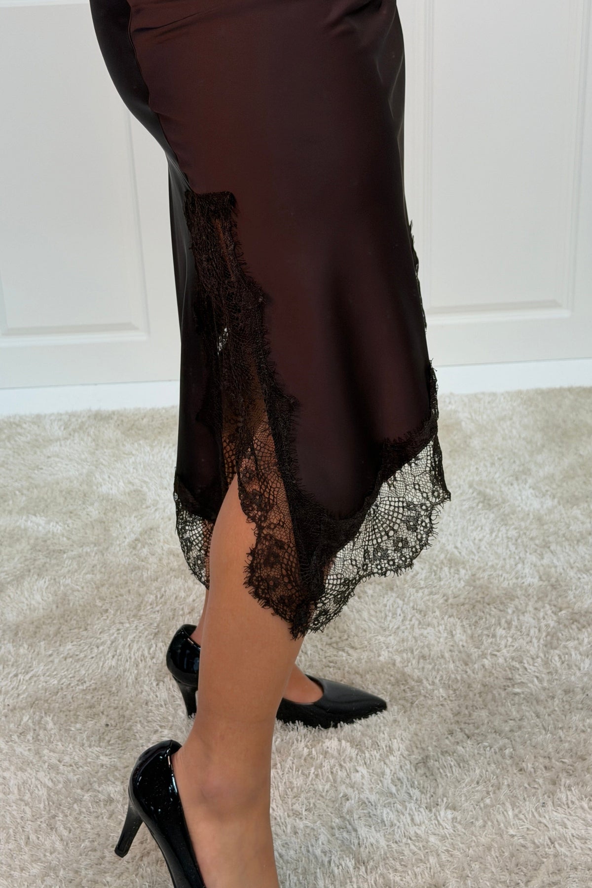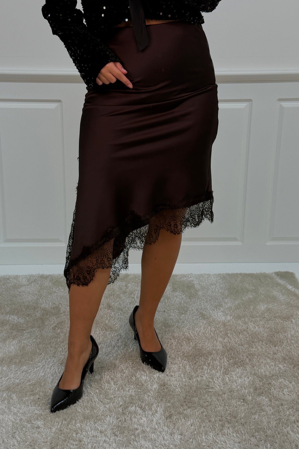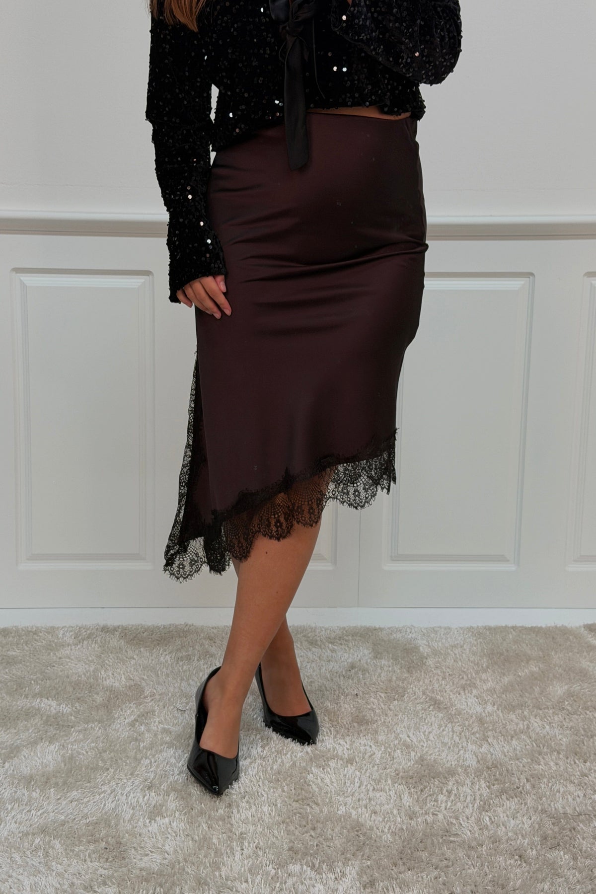 Bruine rok van A-bee met kantdetails langs de rand. De rok is gemaakt van viscose en heeft een lengte tot de kuit met een normale taillehoogte.