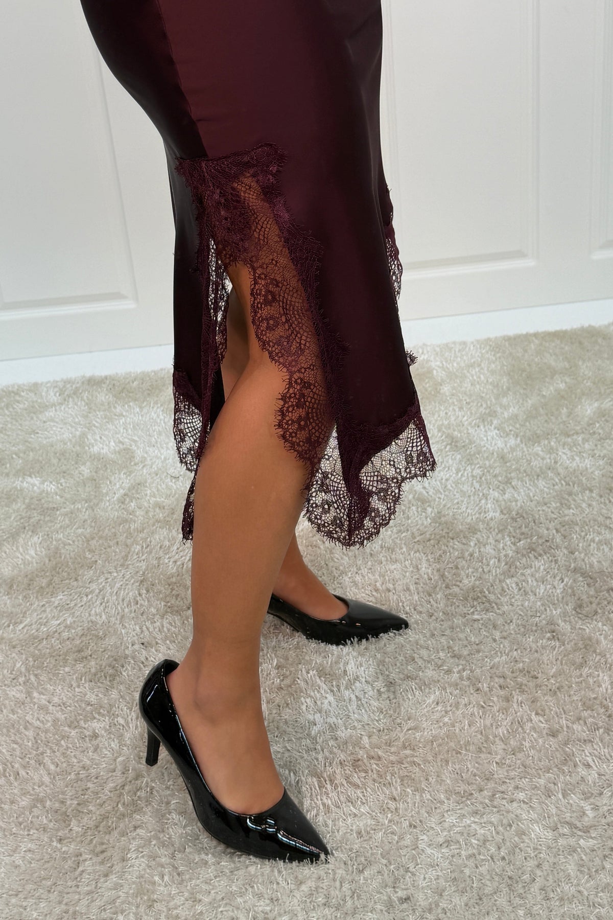 Plomgekleurde rok van A-bee met kantdetails langs de rand. De rok heeft een lengte tot halverwege het onderbeen en een gladde oppervlakte met glanzende afwerking.