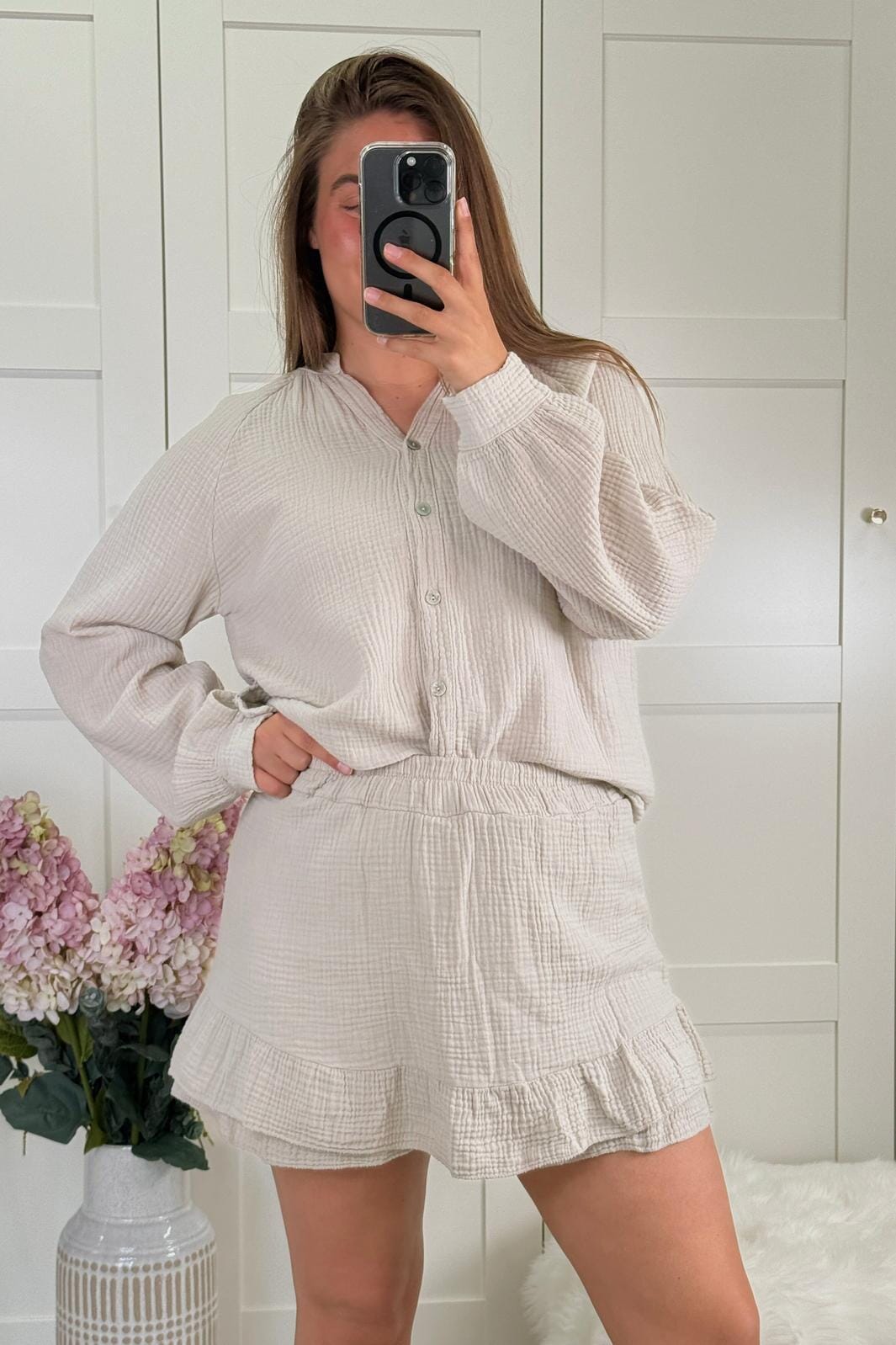 Beige shorts van A-bee met volantrand. De shorts zijn gemaakt van een lichte beige katoen met een zachte textuur en hebben een relaxte pasvorm.