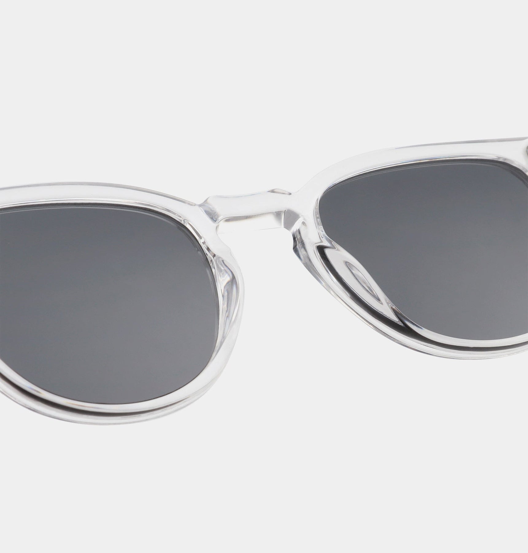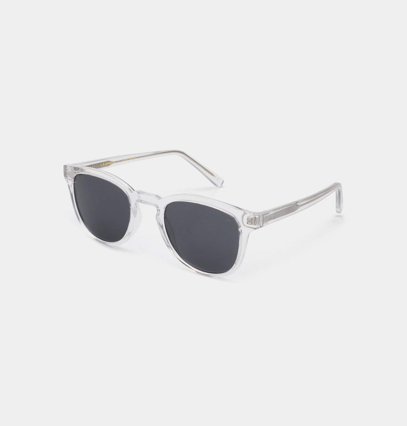Zonnebrillen van A. Kjærbede met een heldere montuur in kristal en donkere lenzen. De brillen hebben UV 400-bescherming en vervormbare pootjes met metalen kernen voor een goede pasvorm.