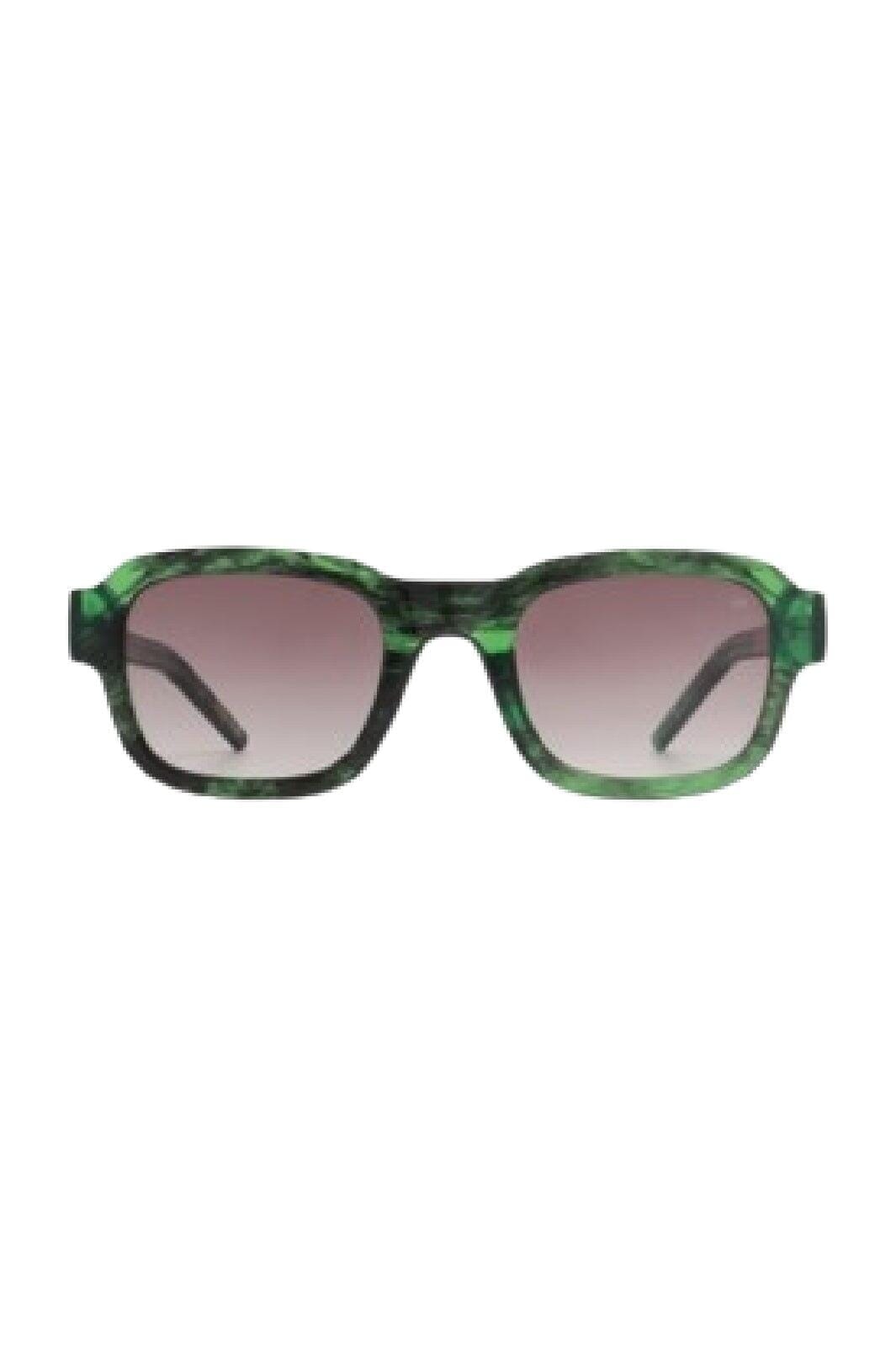 Zonnebrillen van A. Kjærbede met groen gemarmerd, transparant montuur. De brillen hebben UV400-bescherming en zijn uitgerust met optische kwaliteits scharnieren en vervormbare pootjes met metalen kernen.