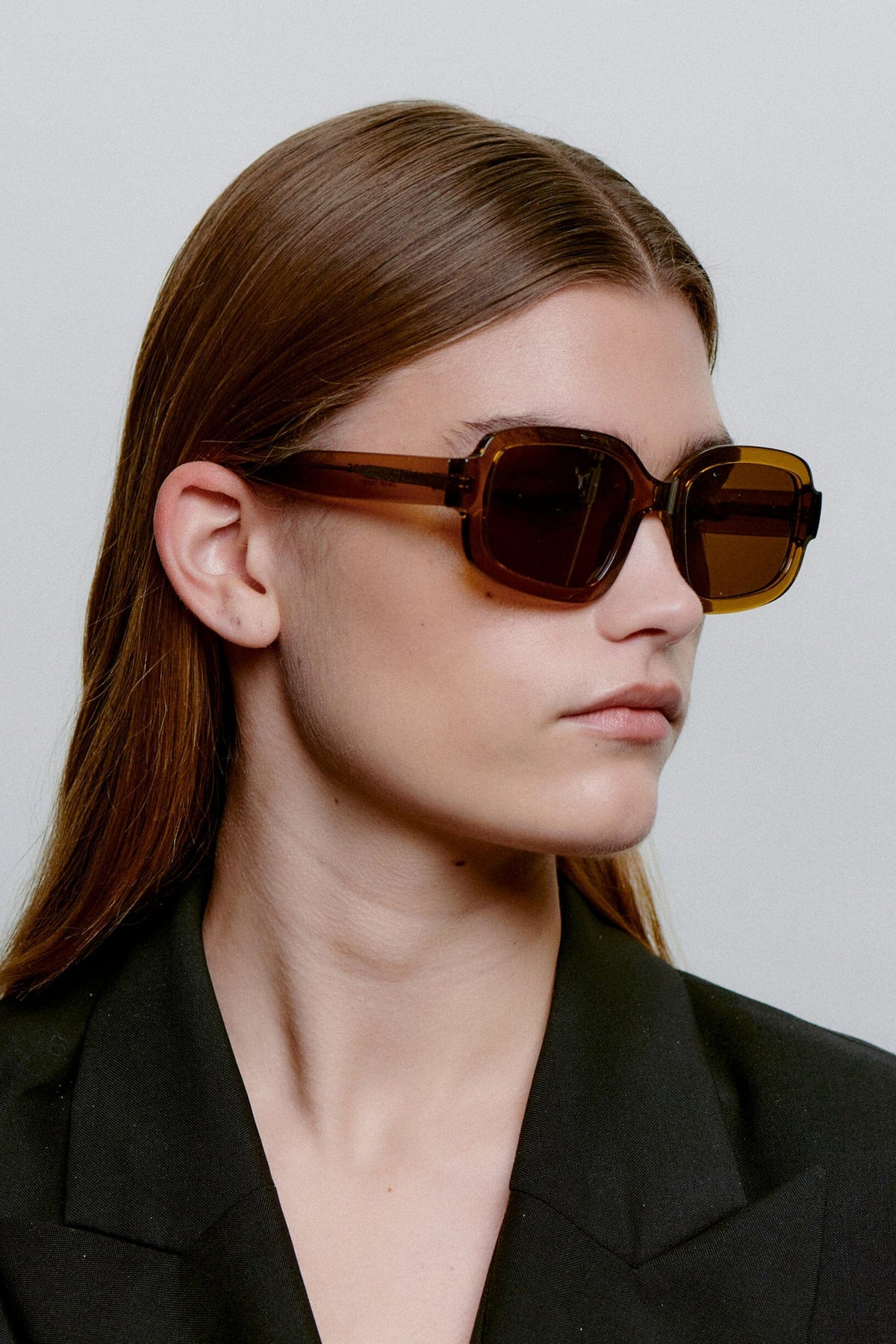 Over-sized zonnebril van A. Kjærbede met een stevige montuur in transparant bruin. De zonnebril heeft een rechthoekige vorm met zachte rondingen en getinte glazen die goede bescherming tegen de zon bieden.