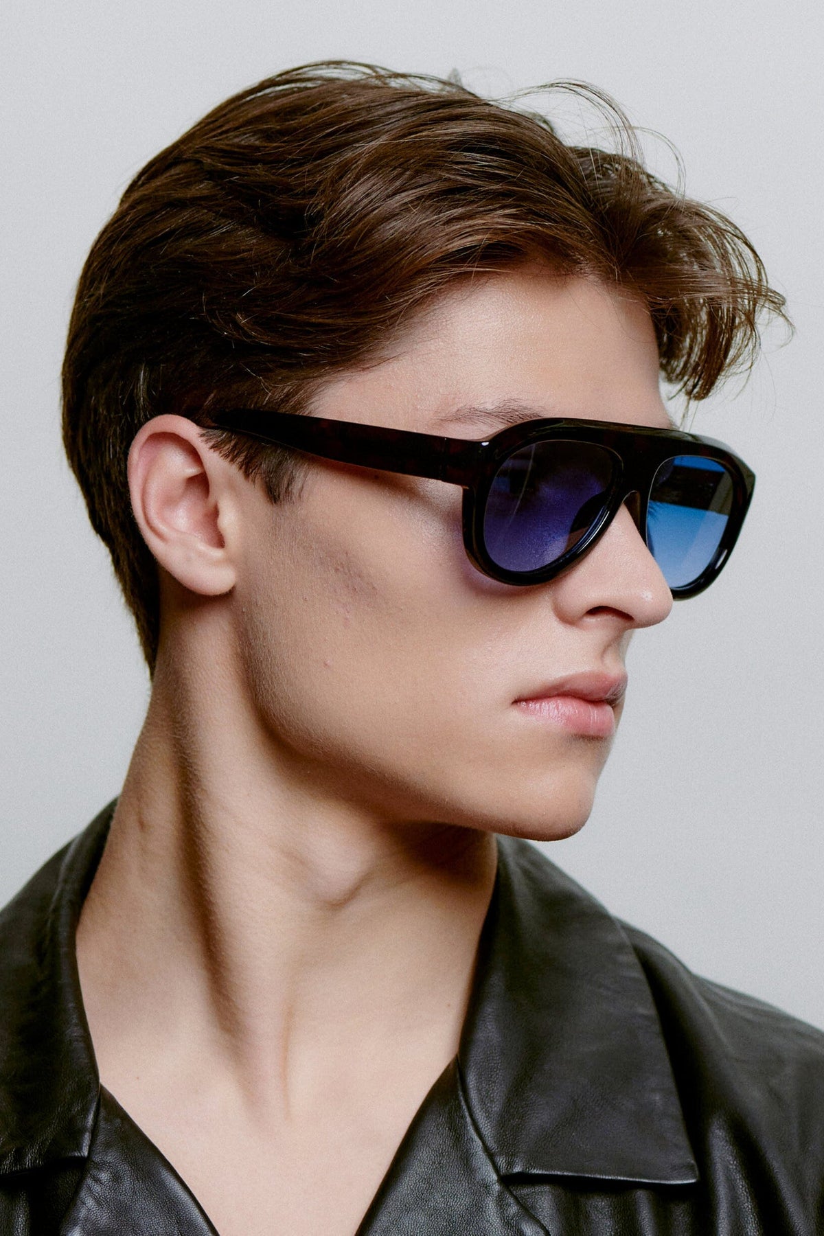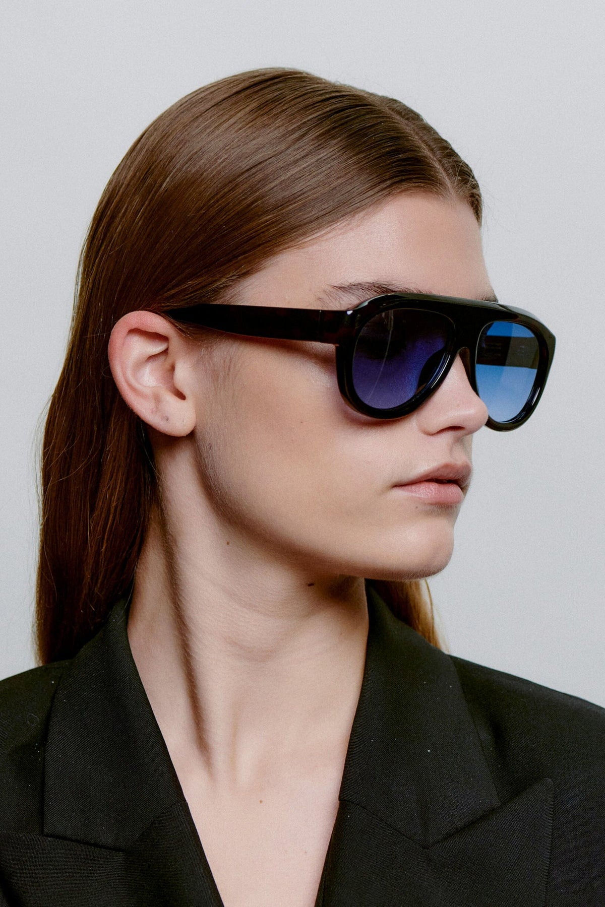 Zonnebrillen van A. Kjærbede in aviator-design met een bruin demi tortoise-kader en blauw getinte lenzen. Het frame heeft een grote, sculpturale vorm met markante lijnen.