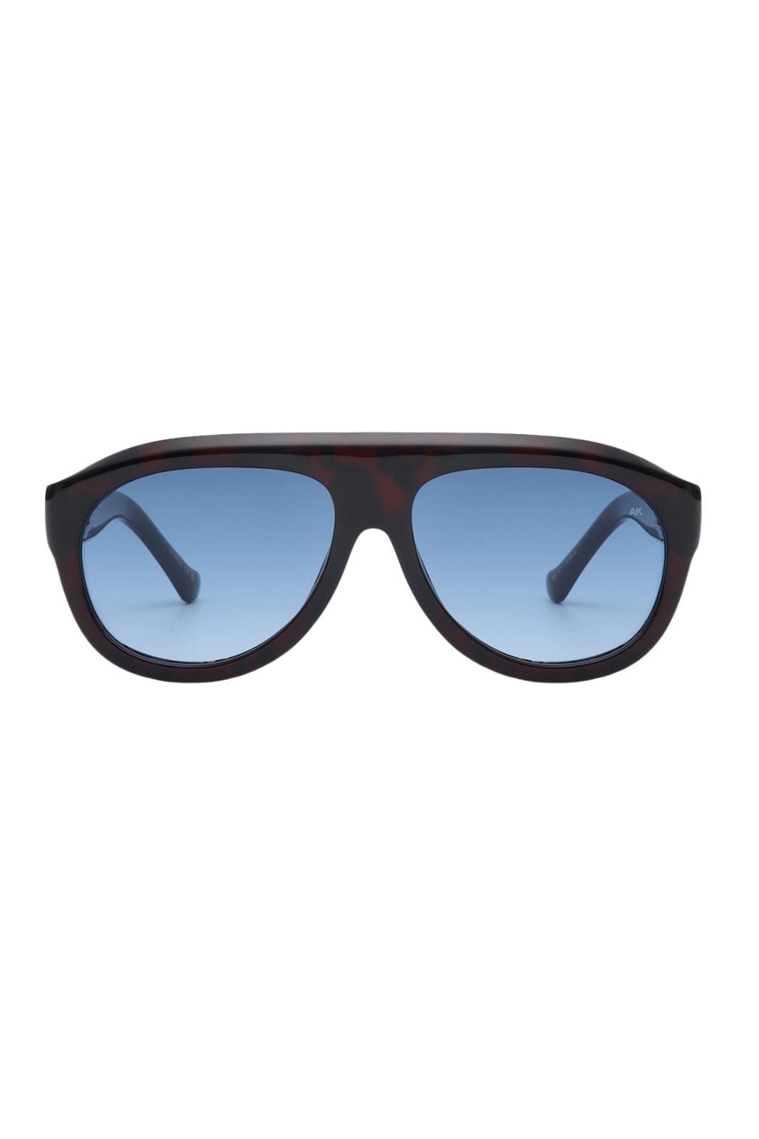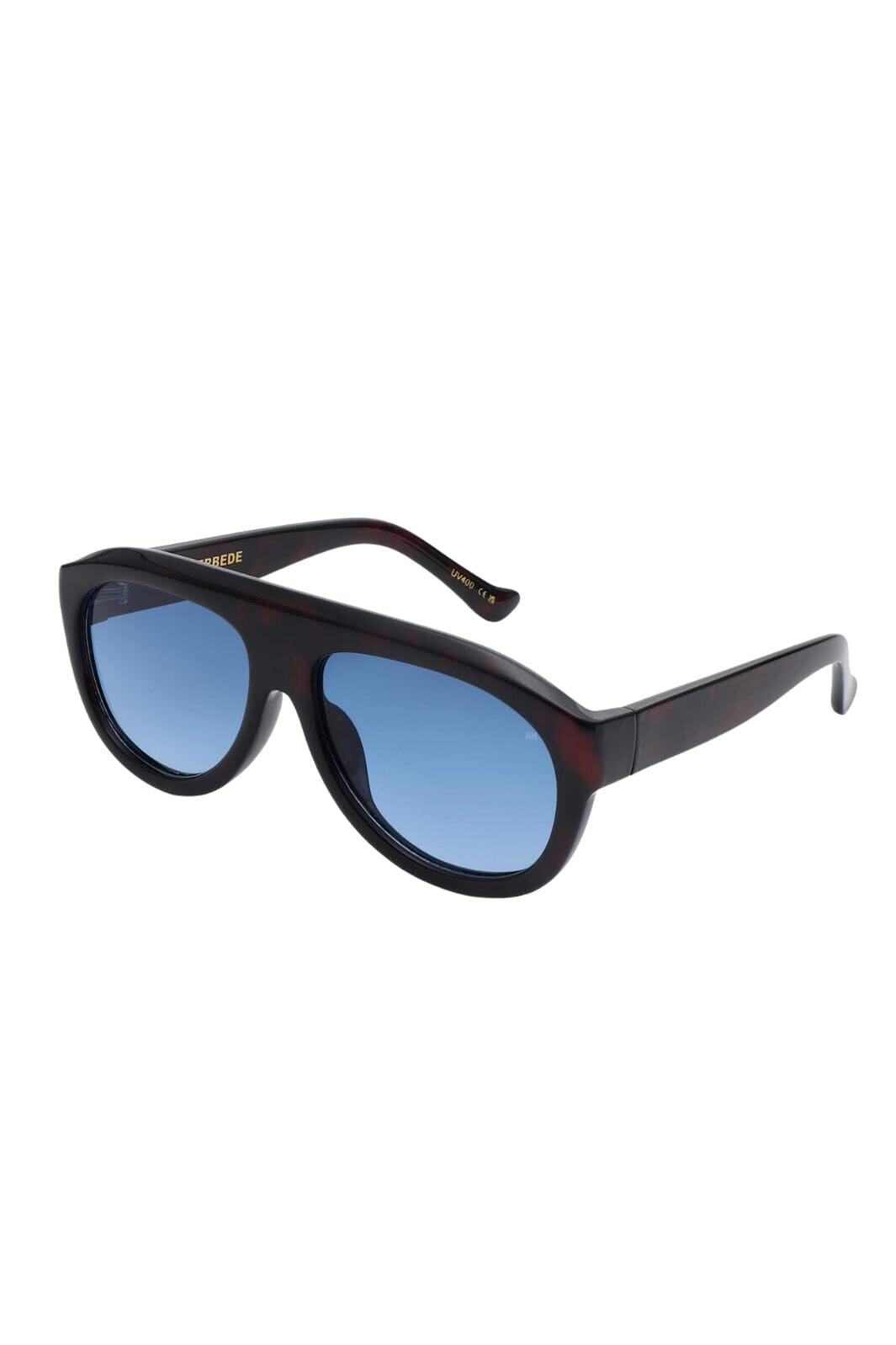 Zonnebrillen van A. Kjærbede in aviator-design met een bruin demi tortoise-kader en blauw getinte lenzen. Het frame heeft een grote, sculpturale vorm met markante lijnen.
