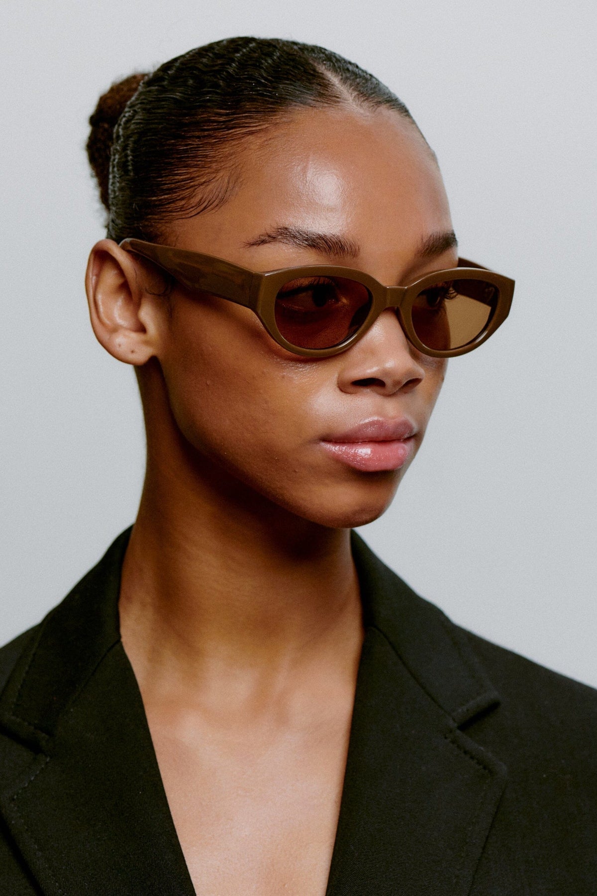 Bruine zonnebrillen van A. Kjærbede met cat-eye vorm. Het montuur heeft een dik ontwerp van donkerbruin Tritan Renew-materiaal met vervormbare pootjes en hoogwaardige optische scharnieren.