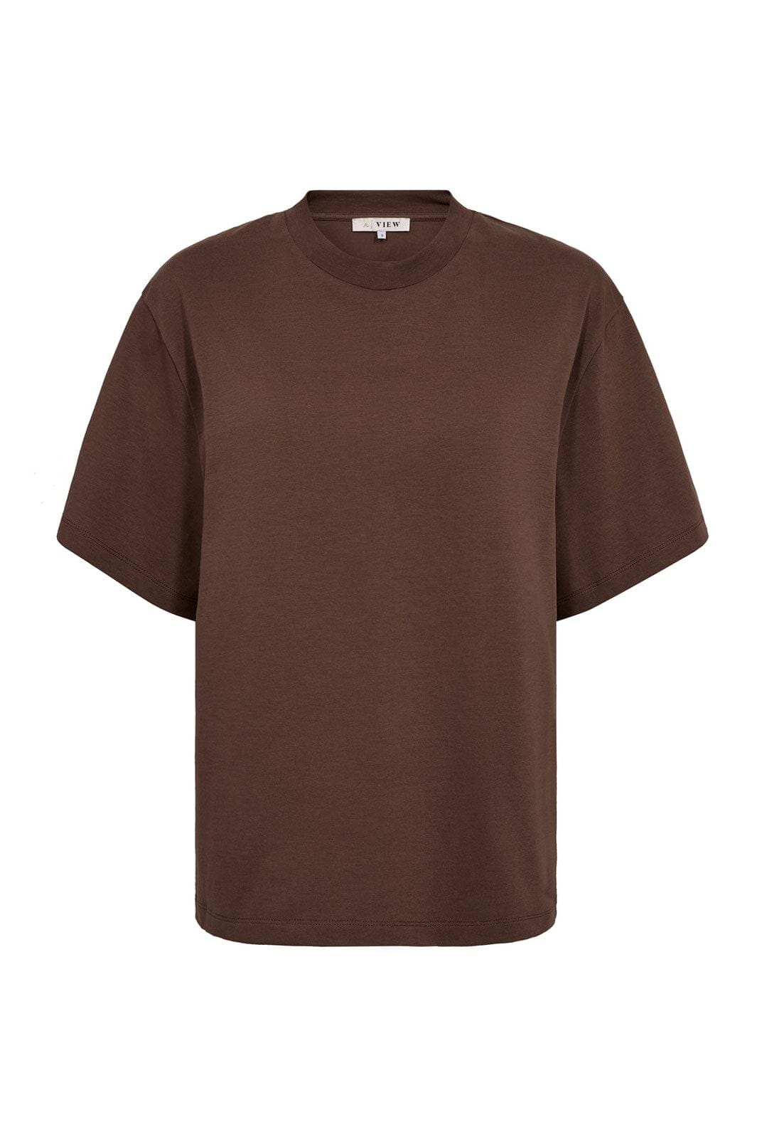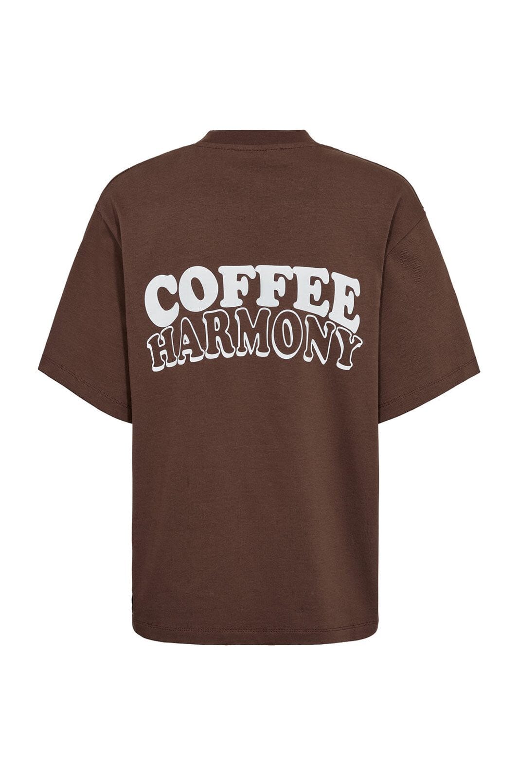 Bruine t-shirt van A-View met een grote COFFEE HARMONY-print op de rug. Het t-shirt heeft een losse pasvorm en is gemaakt van biologisch katoen met een ronde hals.
