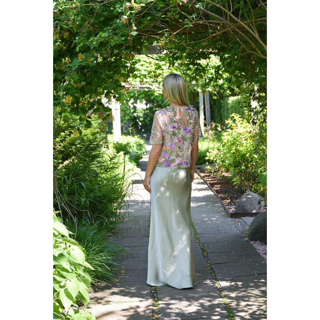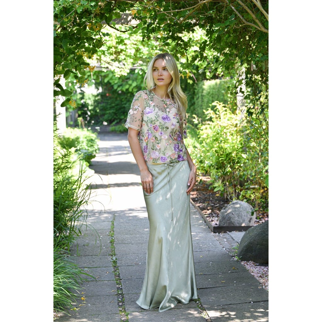 Blouse van A-View, gemaakt van transparant mesh in groene en paarse tinten. De blouse heeft geborduurde bloemen en is geschikt voor zowel formele als feestelijke gelegenheden.