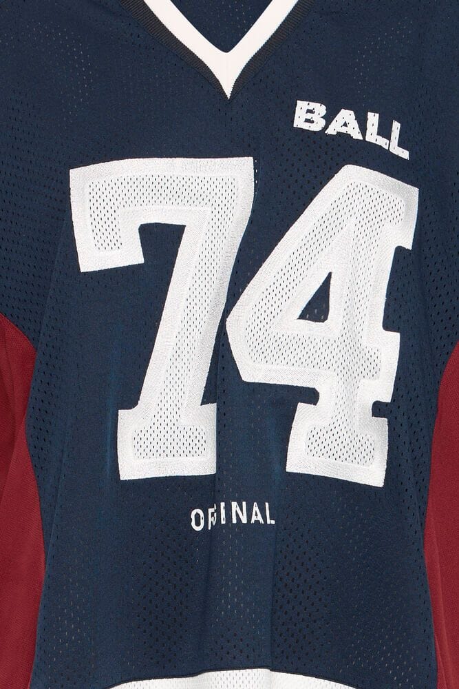 Een donkerblauwe blouse van Ball met decoratieve stiksels en een print met 74 en BALL ORIGINAL in wit en bordeaux.