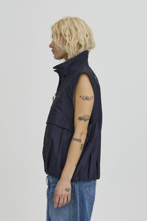 Donkerblauw bodywarmer van Ball, gemaakt van 100% polyamide. Het bodywarmer heeft een hoge kraag en een doorlopende ritssluiting, en de merknaam BALL is zowel aan de voor- als achterkant zichtbaar.
