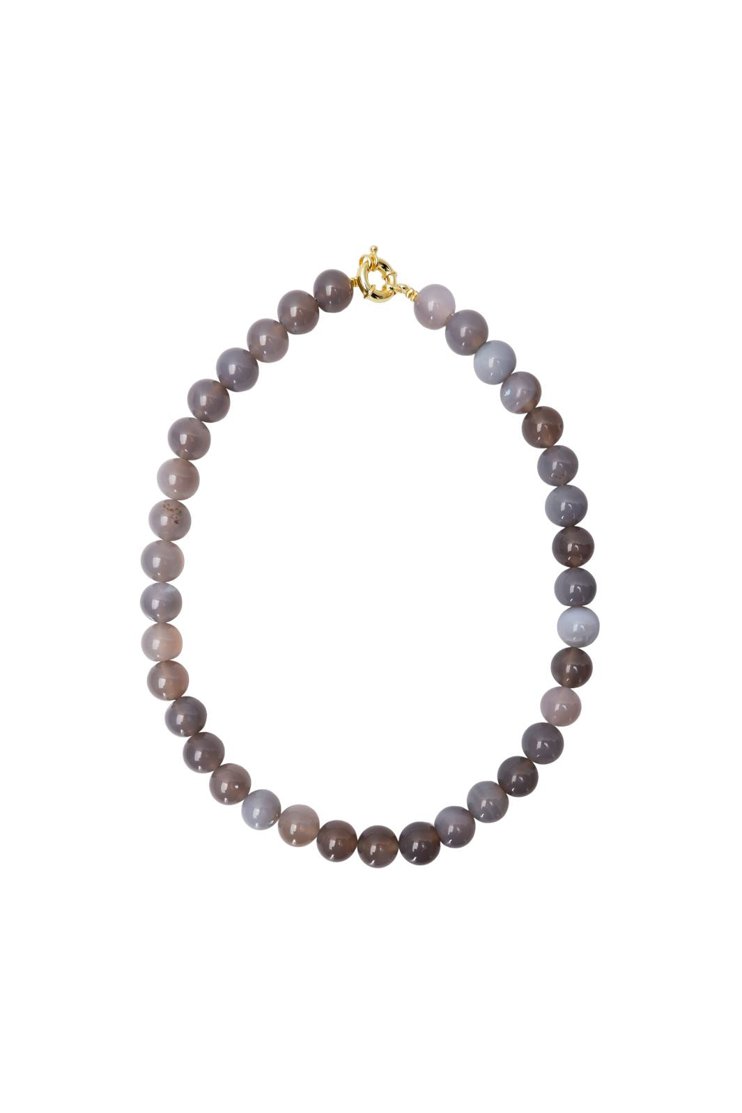 Grijze halsketting van Black Colour met natuursteen van gekleurd agaat. De vergulde messing sluiting zorgt voor een mooie combinatie met de grijze stenen, die een natuurlijke en rustieke uitstraling hebben.