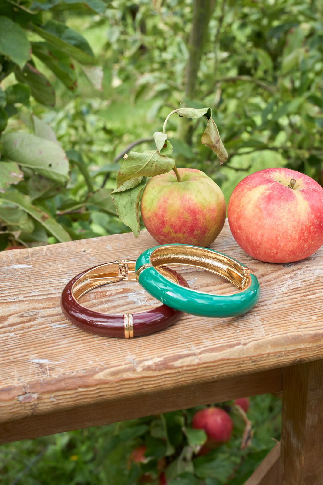Armband van Black Colour met een groene buitenkant en een gouden binnenkant. De ronde vorm heeft een glad oppervlak.
