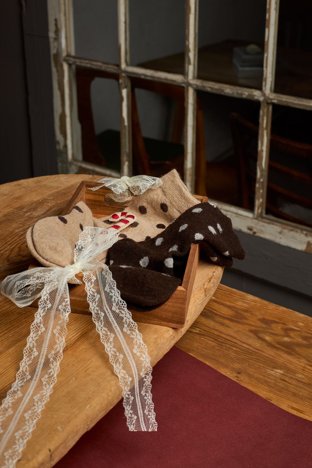 Sokken van Black Colour in donkerbruin met witte polkadots. De sokken hebben een gemiddelde schachtlengte en zijn gemaakt van een zachte materiaalmix met wol.