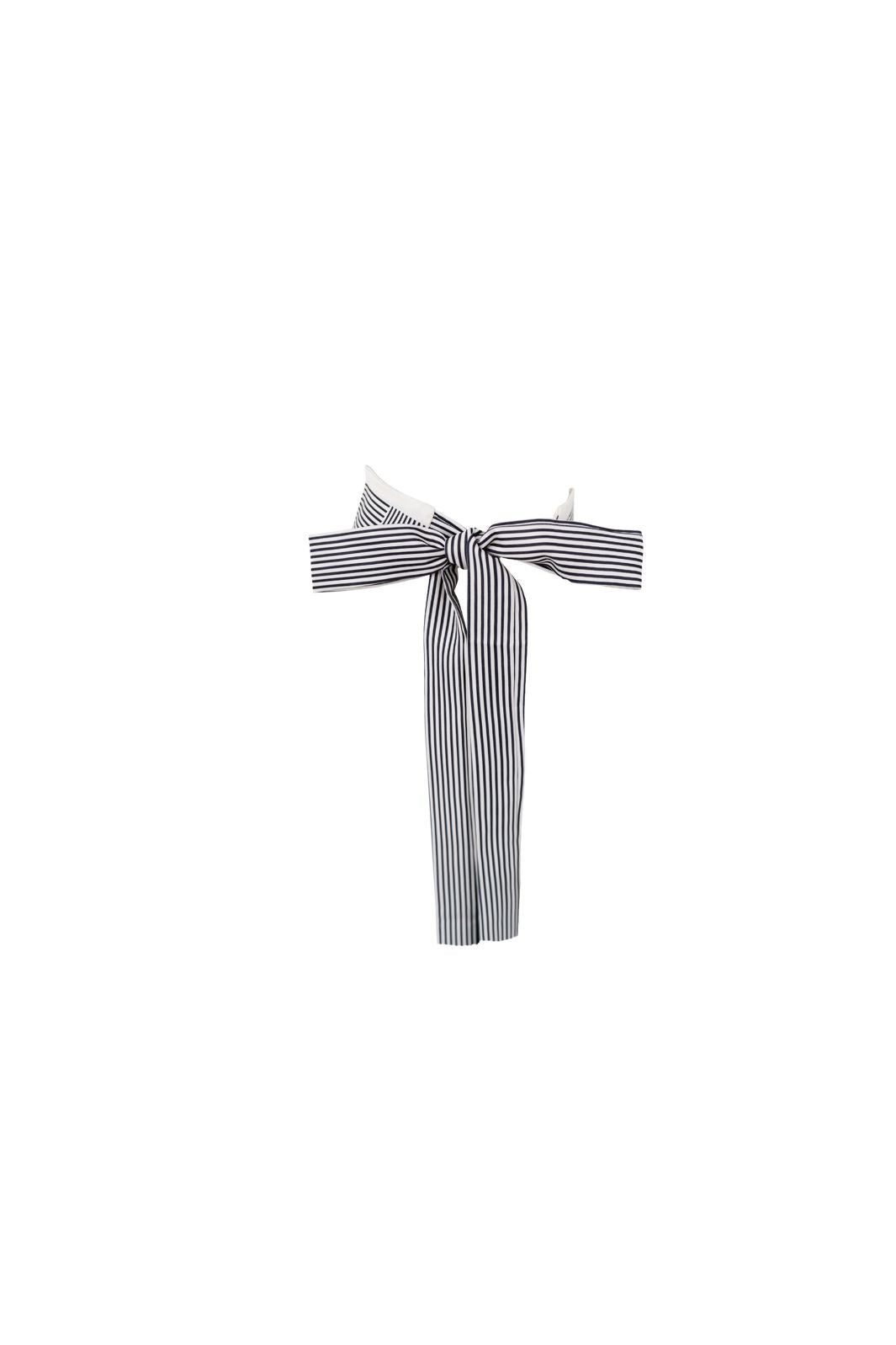Driehoekige sjaal van Black Colour in crème met een geometrisch patroon van zwarte en witte strepen en vierkanten.