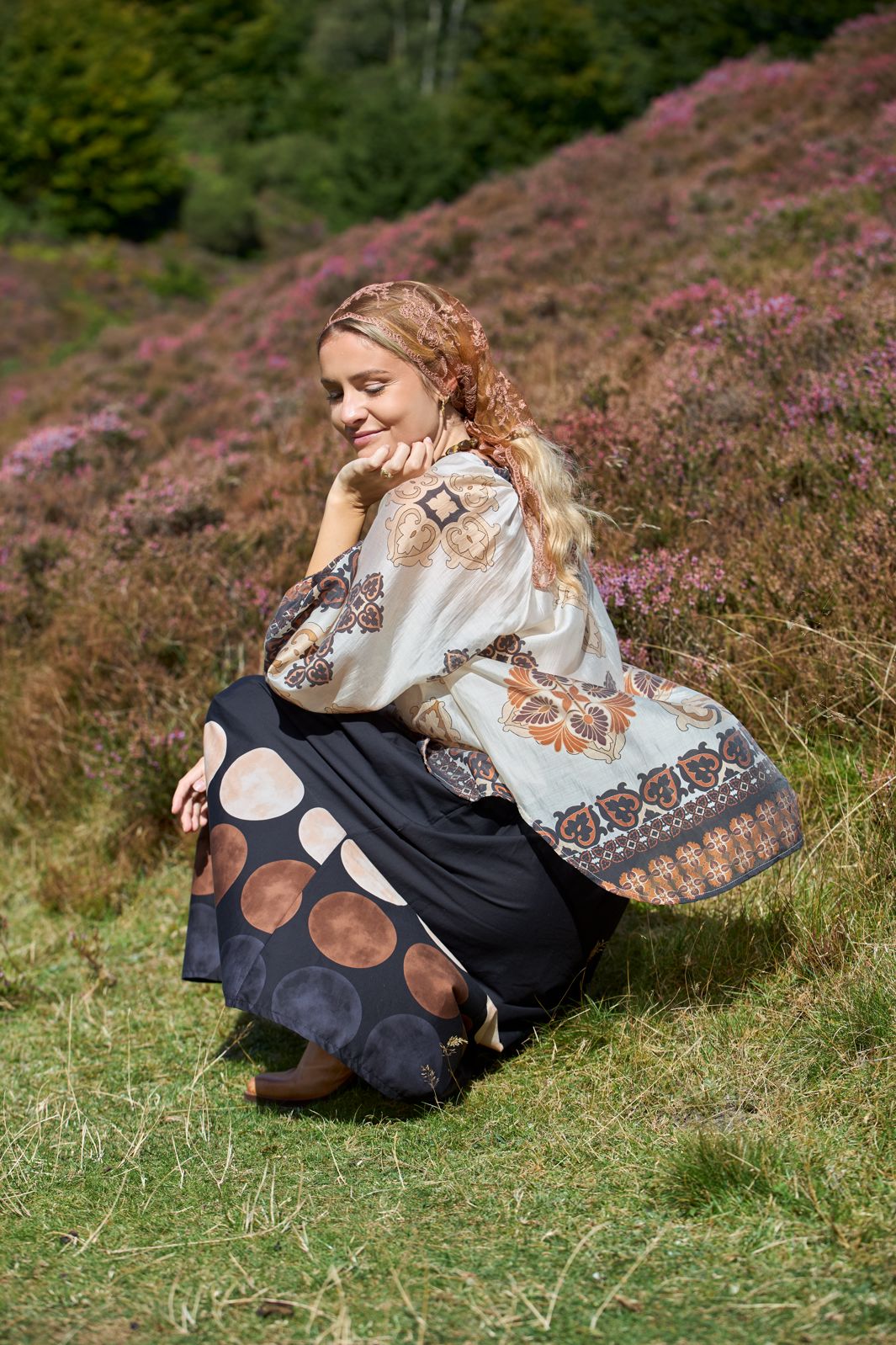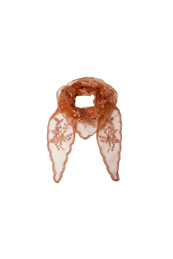 Driedelig sjaal van Black Colour in tabakkleurige nuance. De sjaal heeft een transparant kantmateriaal met bloemenborduursel over het hele oppervlak.