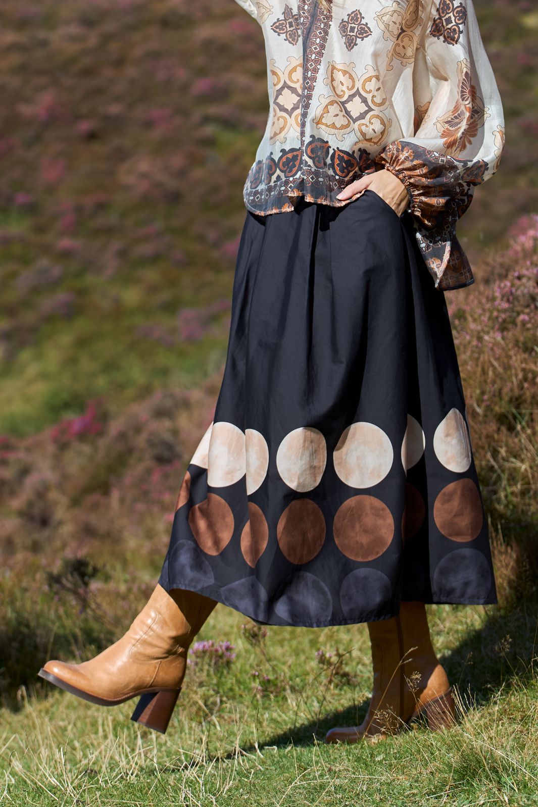 Zwarte rok van Black Colour met grote stippen in bruin en beige langs de rand. De rok heeft een hoge taille en komt tot aan de kuiten met een relaxte pasvorm.
