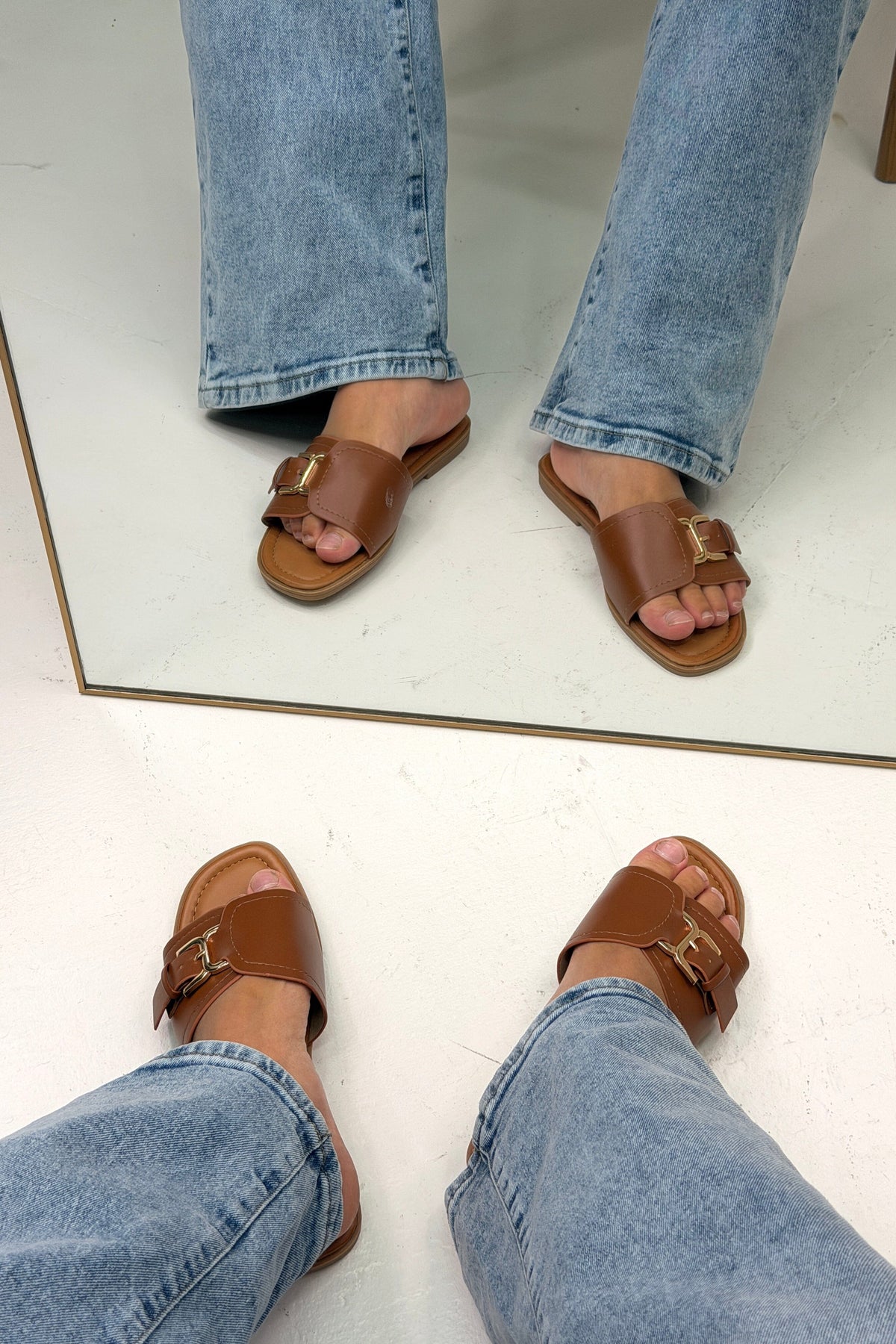 Sandalen van Bloom in een kamelkleurige tint. De sandalen hebben een open teen en een lage achterkant, waardoor ze comfortabel zijn om op te lopen.