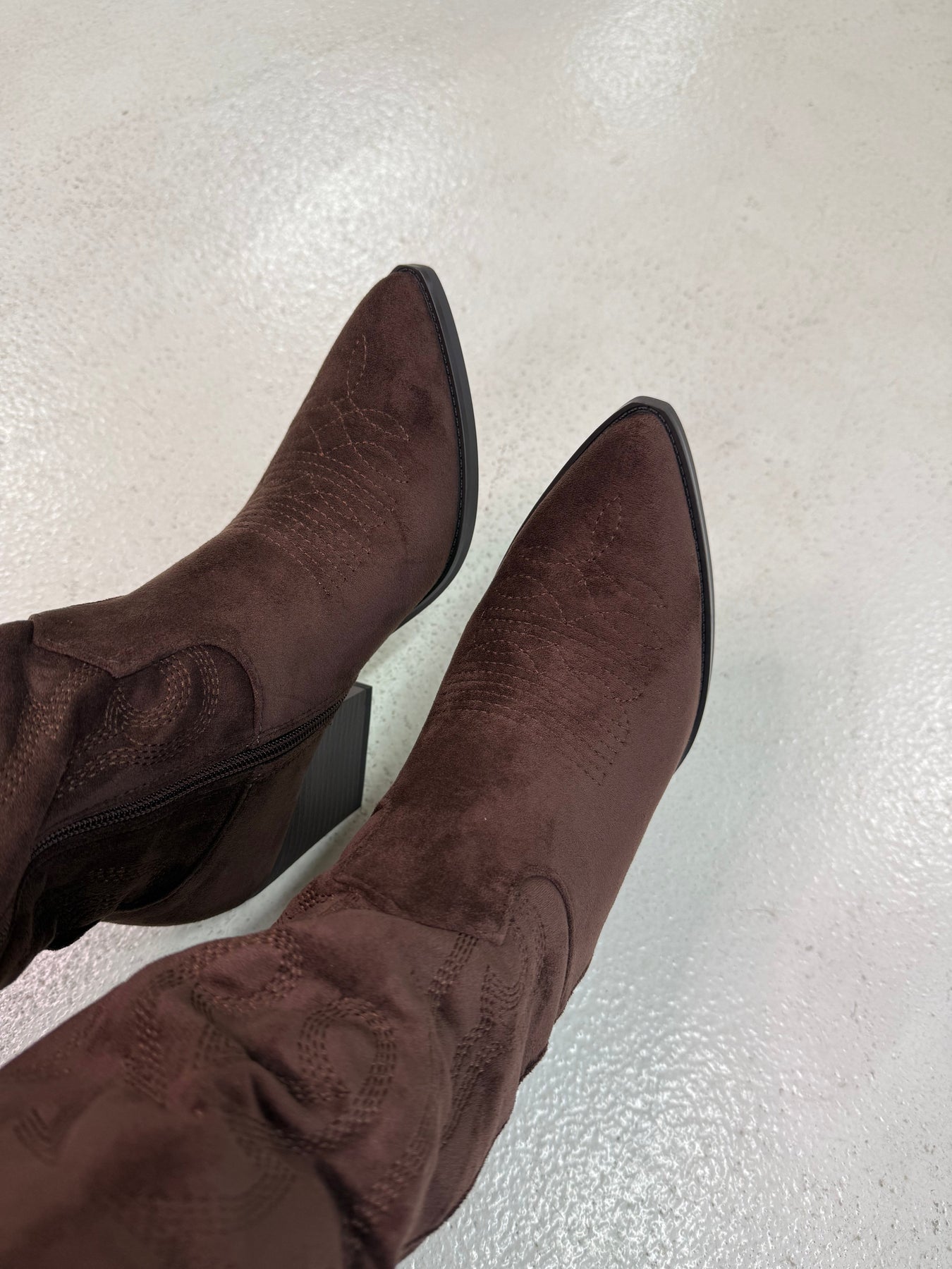 Laarzen van Bloom in bruin met decoratieve stiksels langs de schacht. De laarzen hebben een blokhak en een spitse neus.