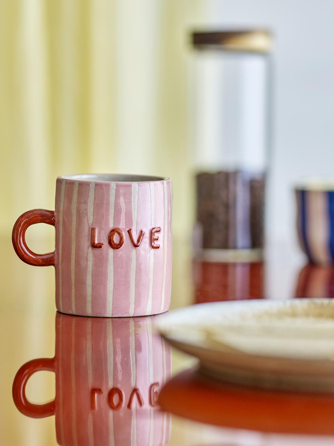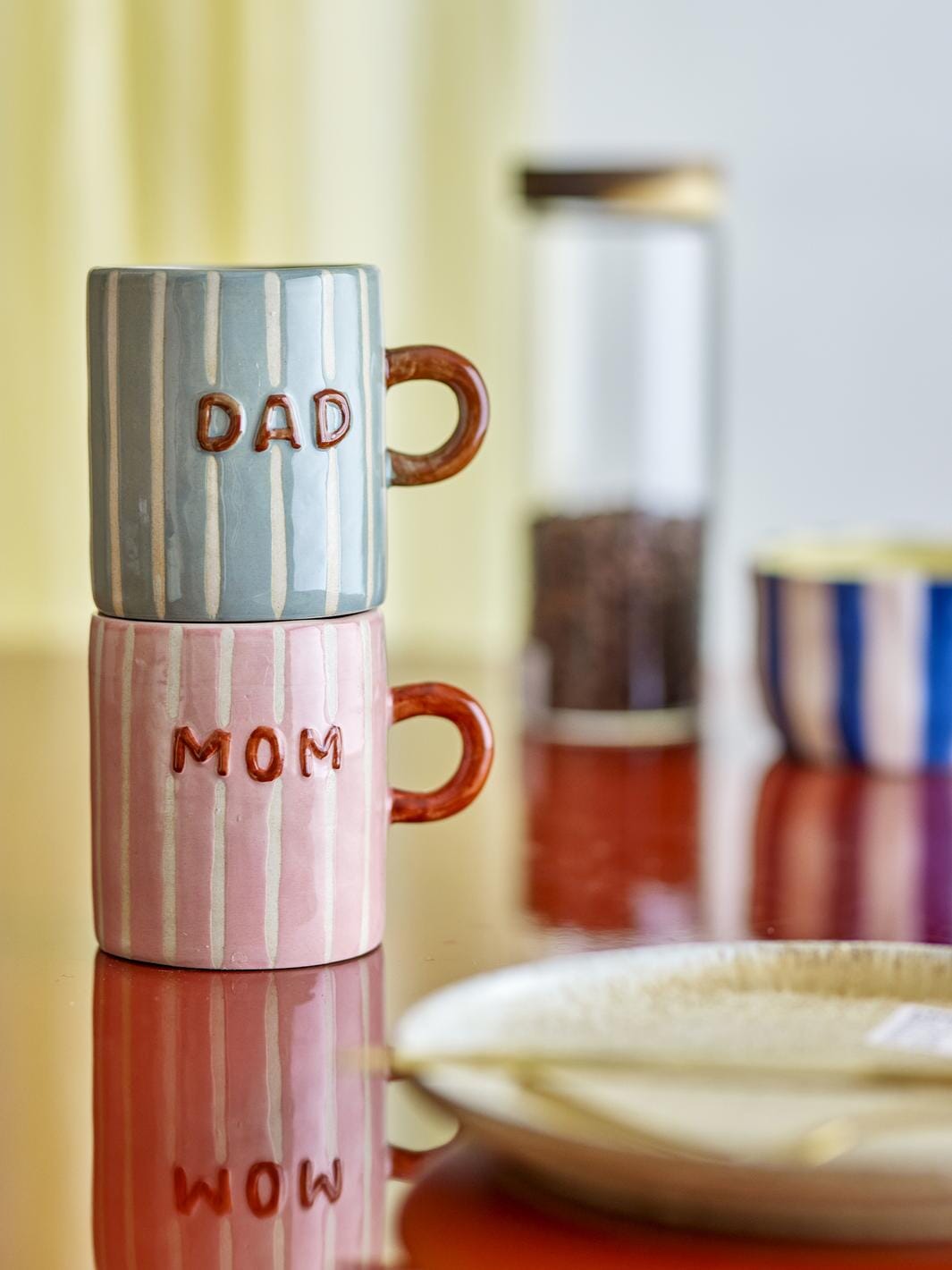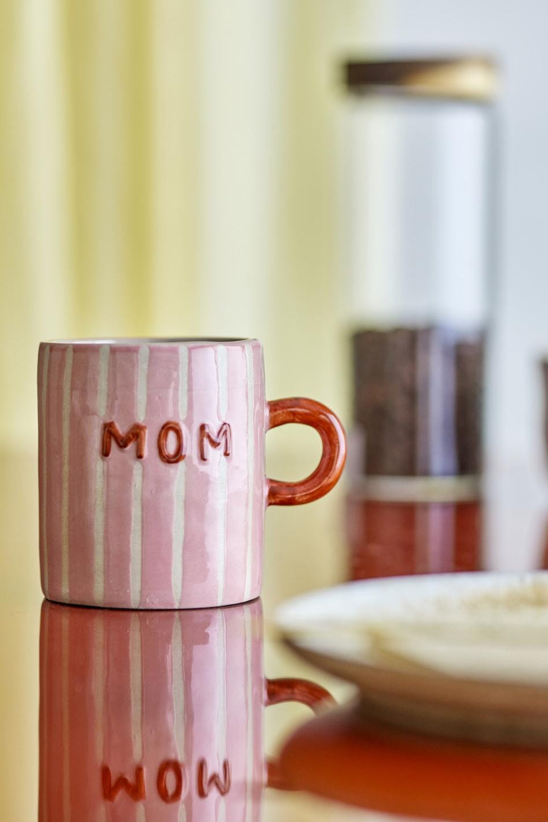 Roze mok van Bloomingville van steengoed met handgeschilderde verticale crèmekleurige strepen. Het woord MOM staat aan beide zijden gedrukt en het oor is donker terracottakleurig.