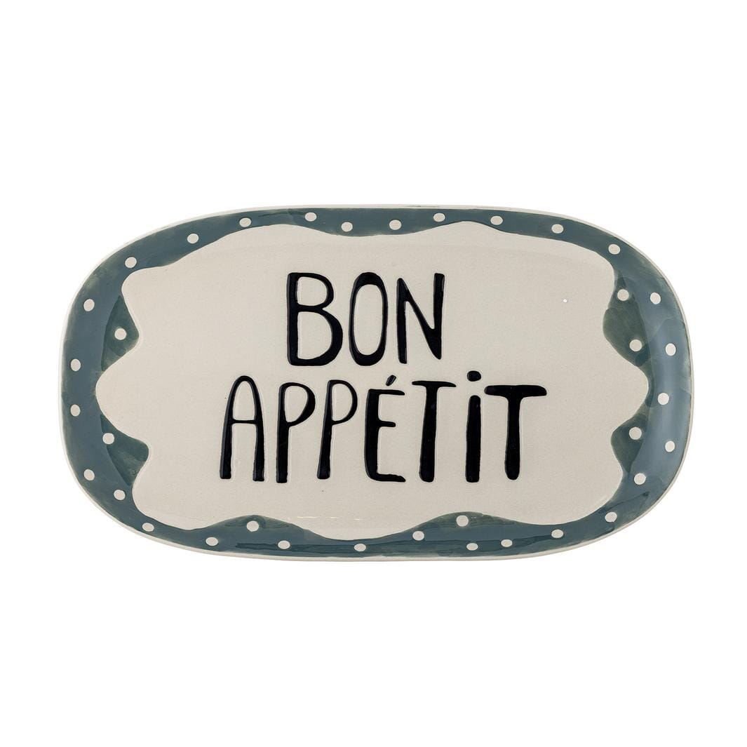 Serveerschaal van Bloomingville, gemaakt van steengoed. Handgeschilderde details met de tekst Bon Appétit in het midden. De rand heeft zachte lijnen en kleine witte stippen op een blauwgroene ondergrond.