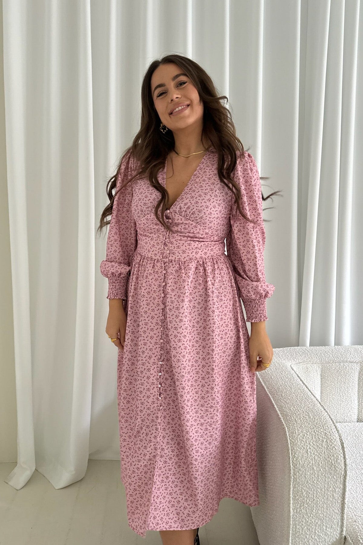 Lange jurk van BYIC in roze met bloemenprint. De jurk heeft een gemarkeerde taille en een v-hals met knopen aan de voorkant. De puffmouwen geven de jurk een vrouwelijke uitstraling.