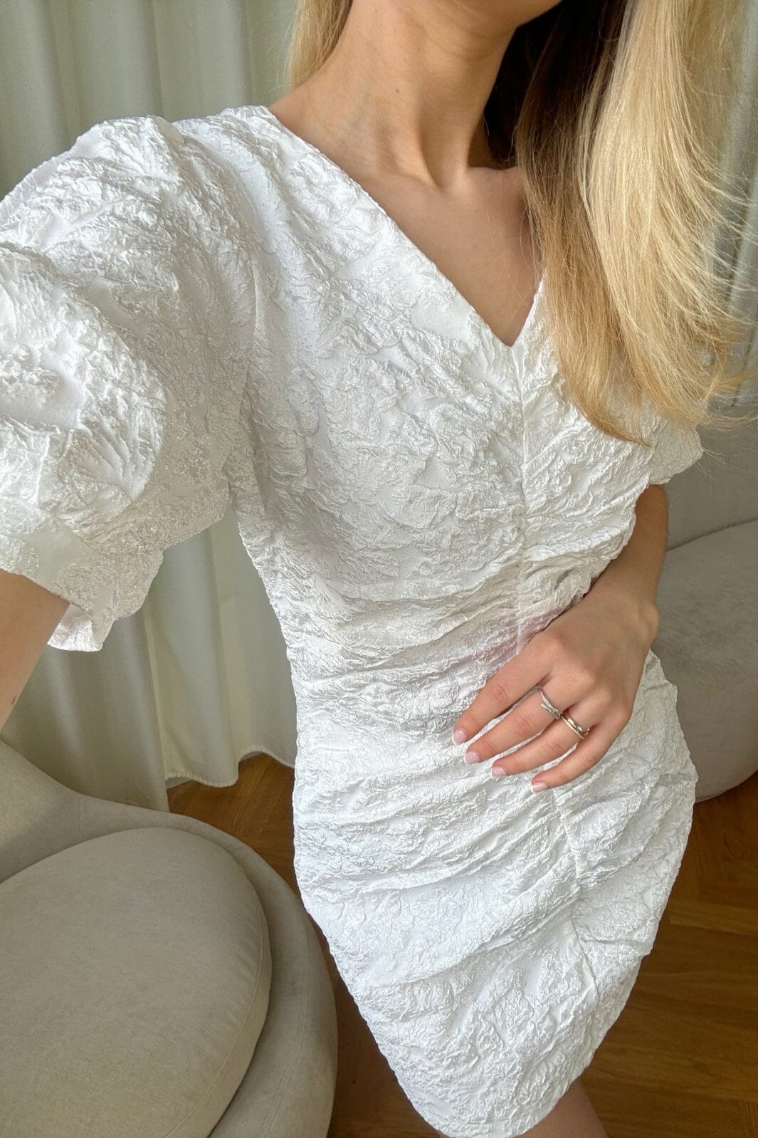 Witte jurk van BYIC met gerimpelde textuur en V-hals. De jurk heeft korte puffmouwen en een korte lengte, waardoor deze geschikt is voor feestelijke gelegenheden.