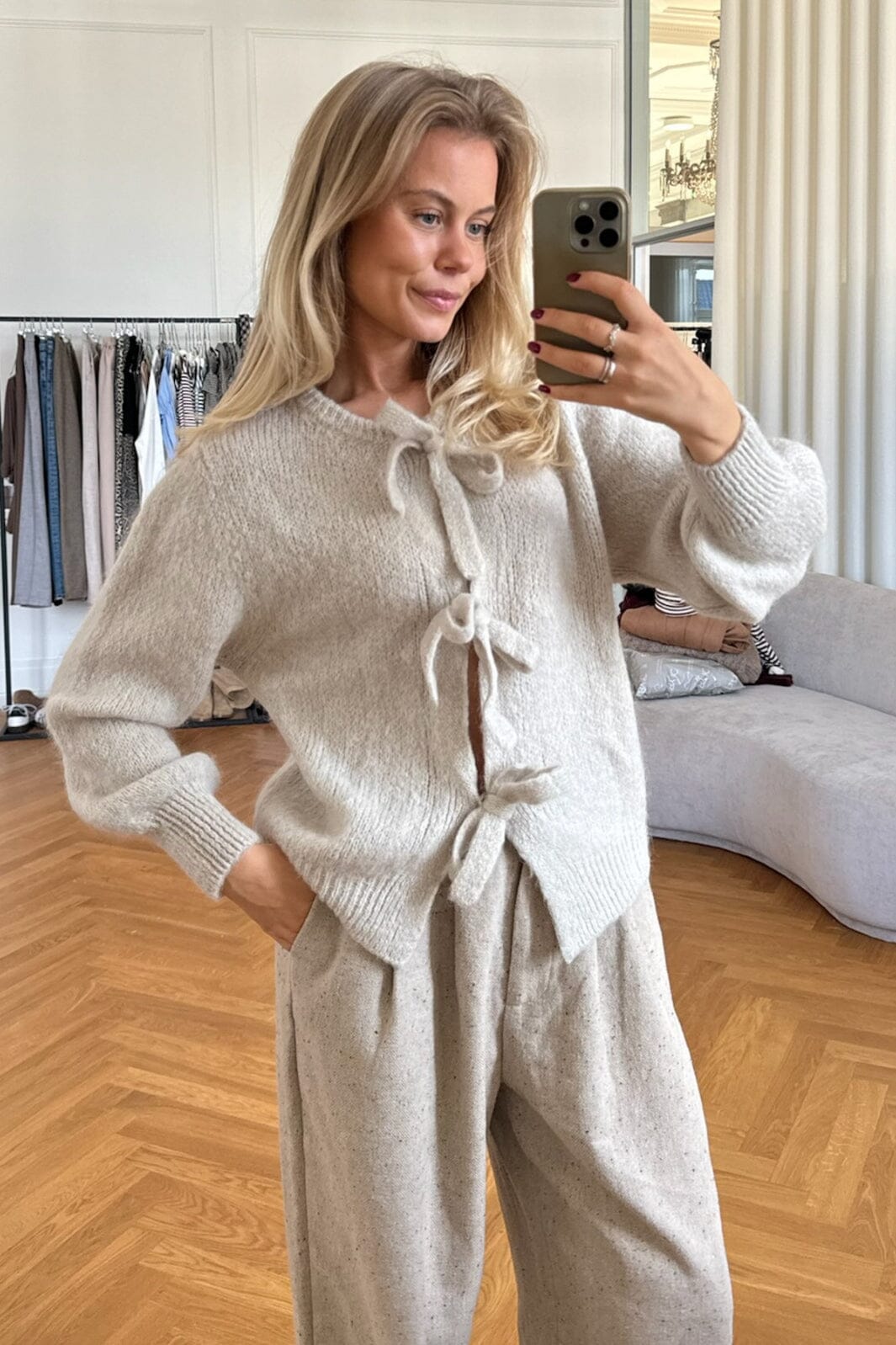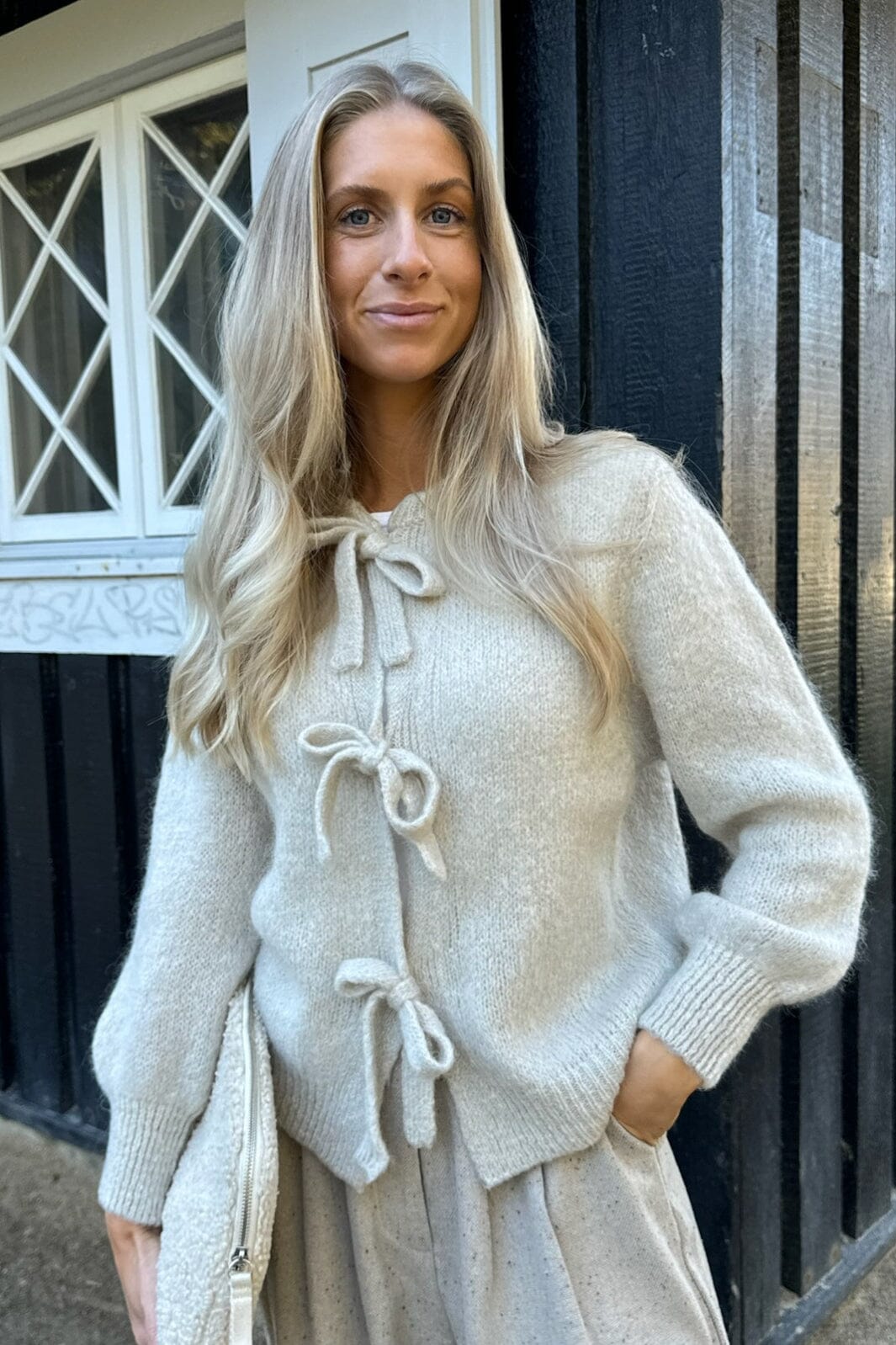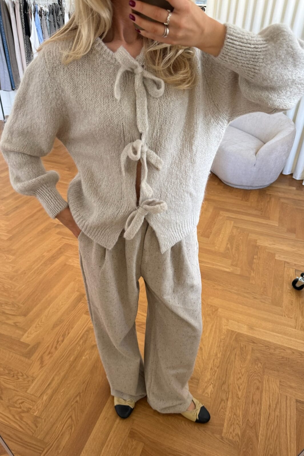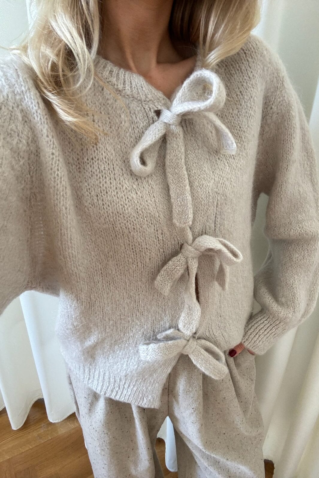 Beige cardigan van BYIC met gemêleerd breiwerk en drie strikbanden aan de voorkant. De volumineuze mouwen met ribdetails en de zachte mohairmix geven de cardigan een bijzondere uitstraling.