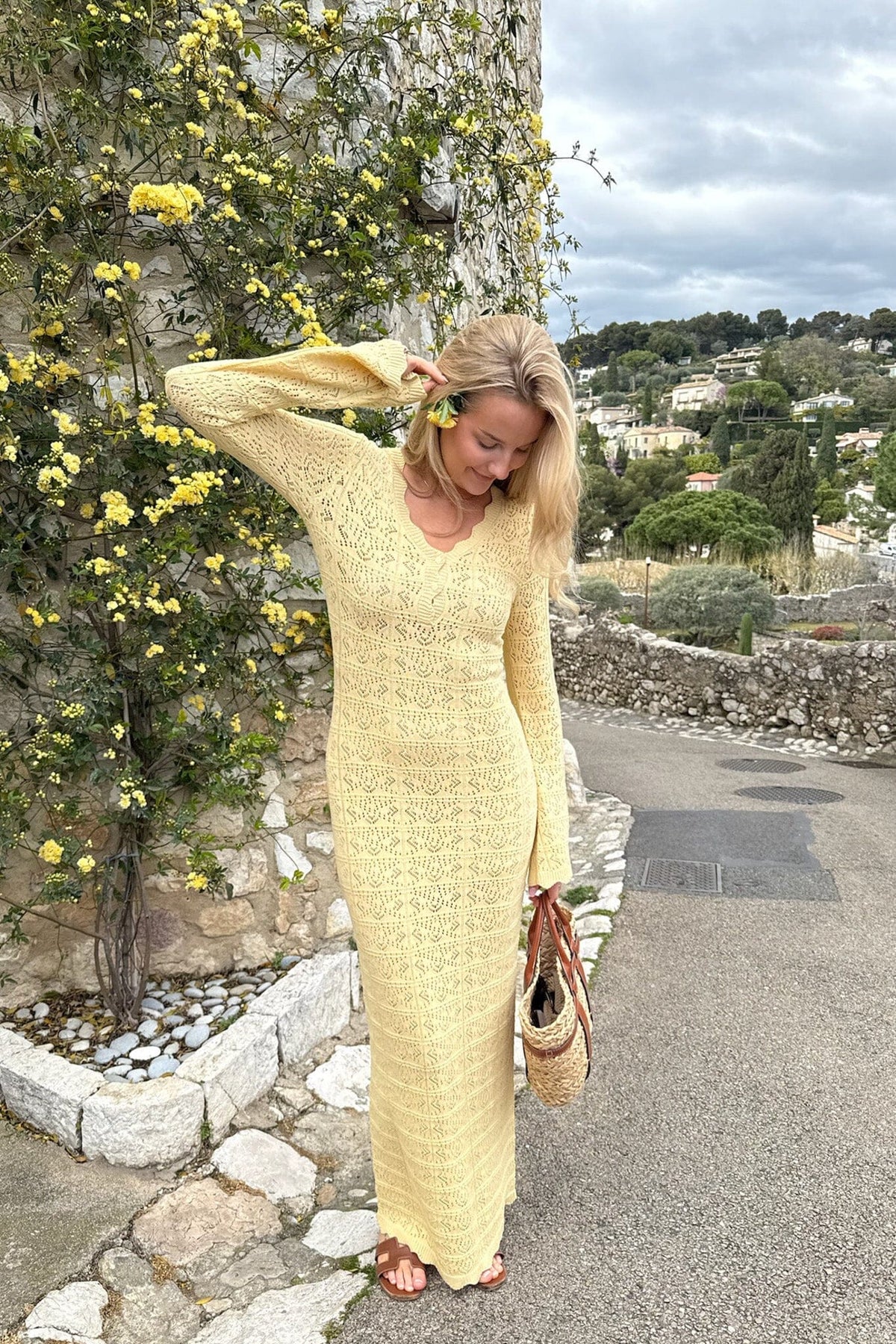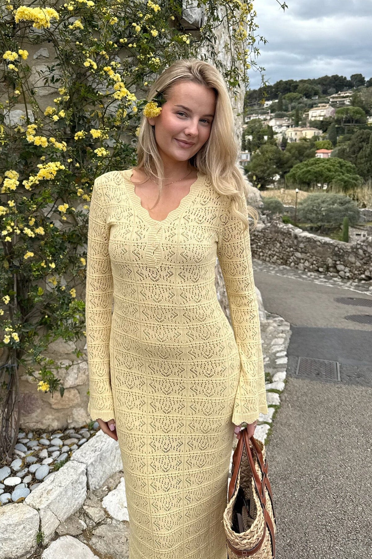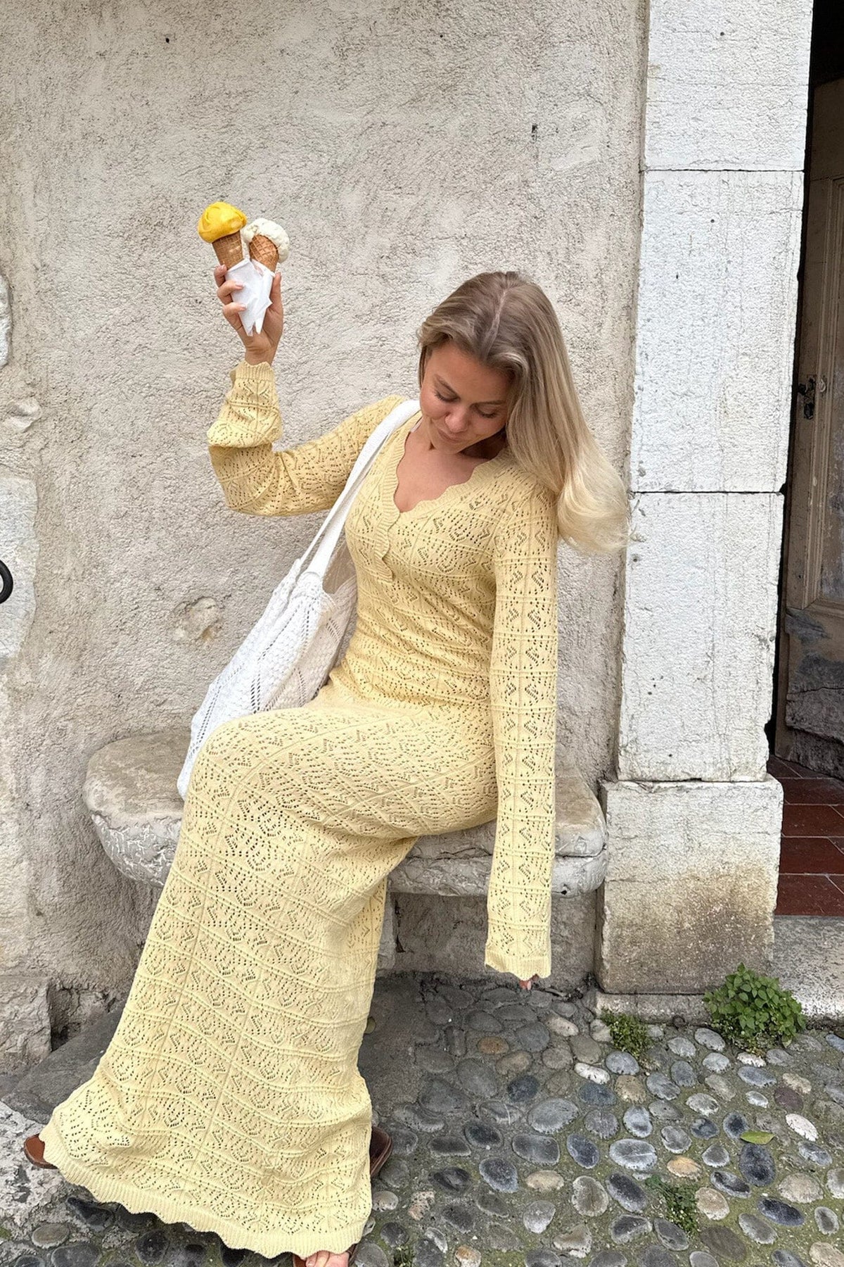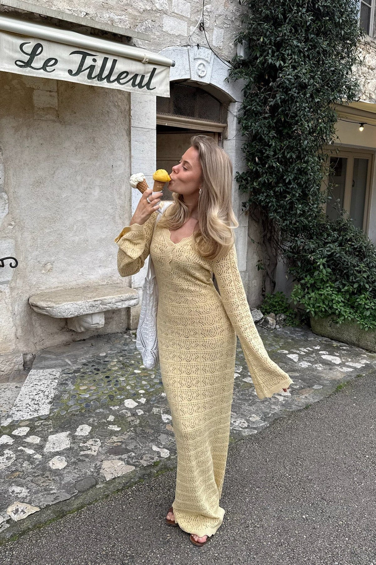Geel maxikleed van BYIC met gebreid patroon. Het kleed heeft lange mouwen en een V-halslijn met golvende rand. Het moet met een onderkleed worden gedragen, omdat de stof licht doorschijnend is.