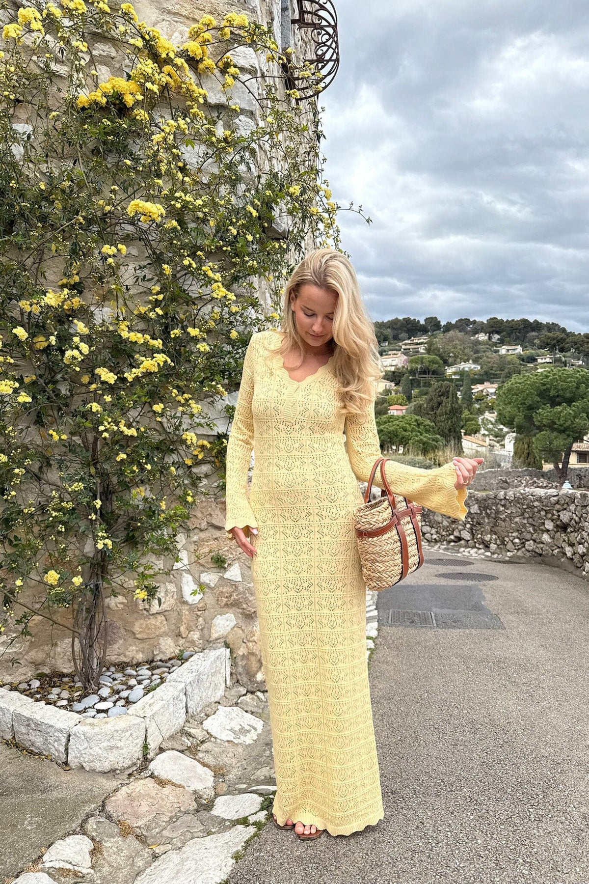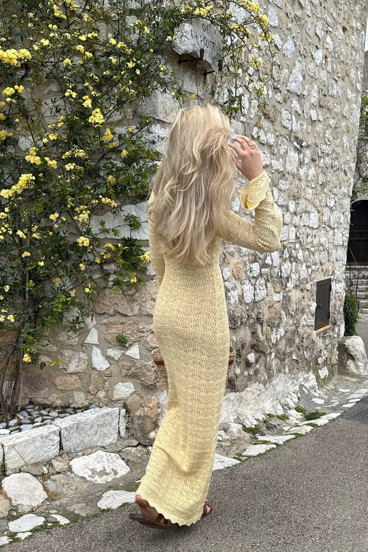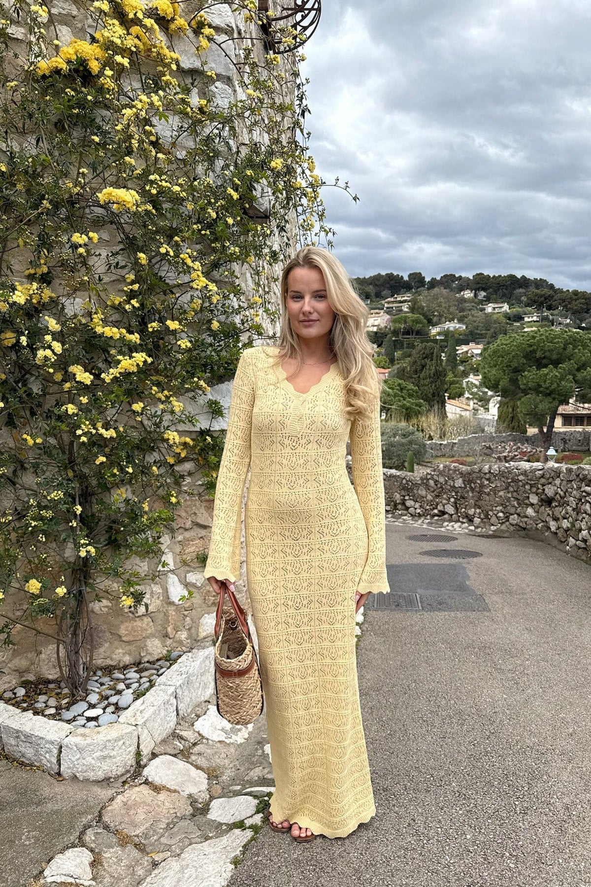 Geel maxikleed van BYIC met gebreid patroon. Het kleed heeft lange mouwen en een V-halslijn met golvende rand. Het moet met een onderkleed worden gedragen, omdat de stof licht doorschijnend is.