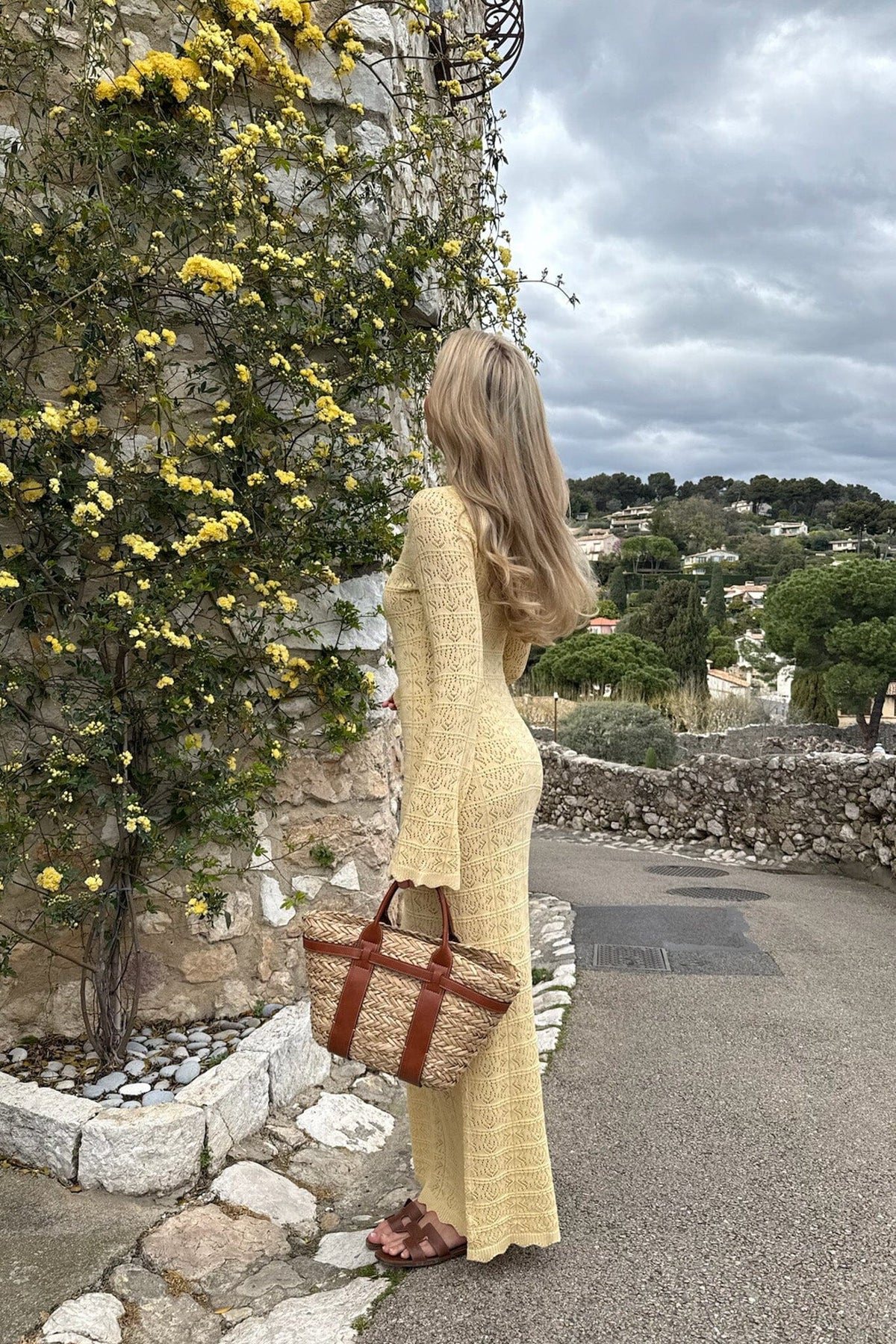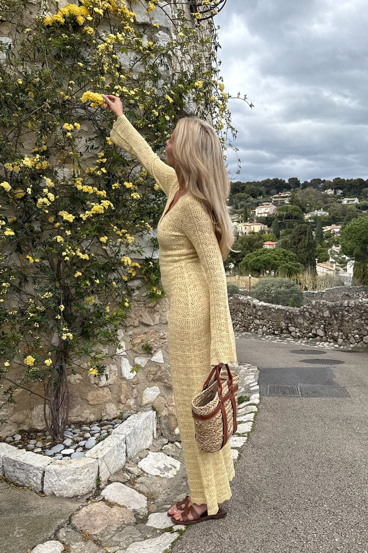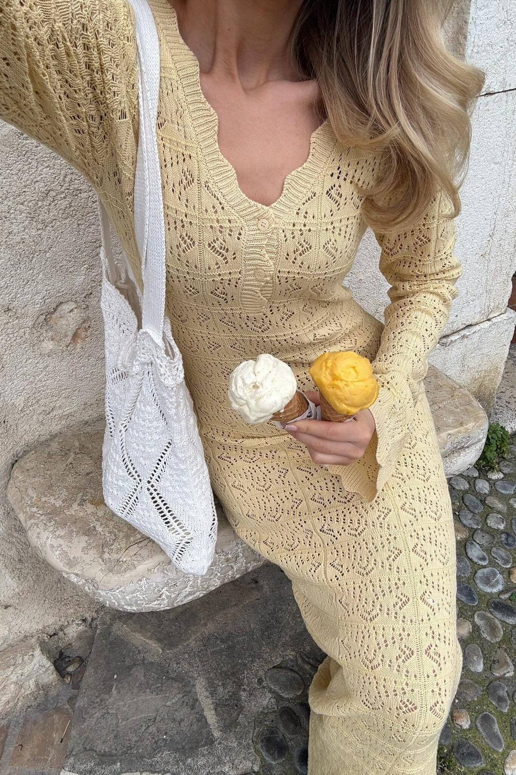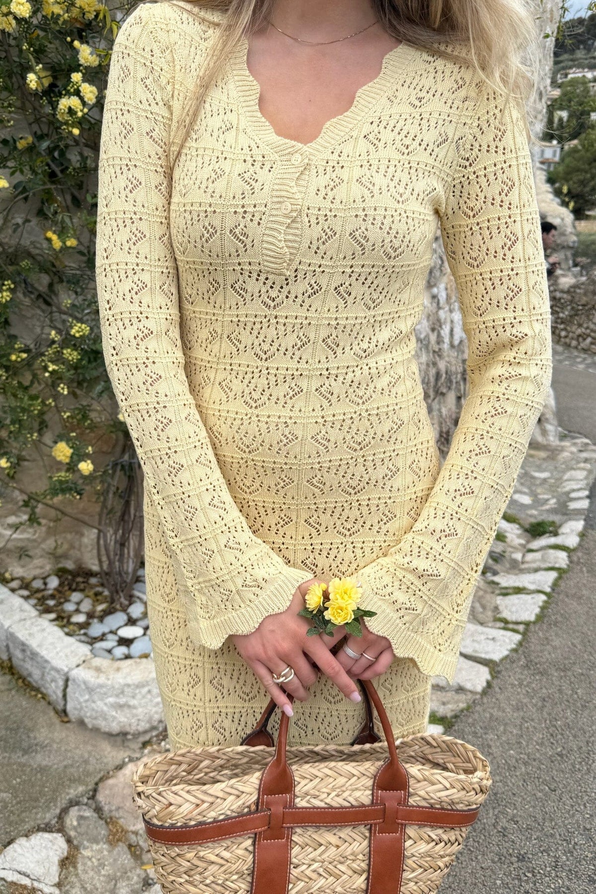 Geel maxikleed van BYIC met gebreid patroon. Het kleed heeft lange mouwen en een V-halslijn met golvende rand. Het moet met een onderkleed worden gedragen, omdat de stof licht doorschijnend is.