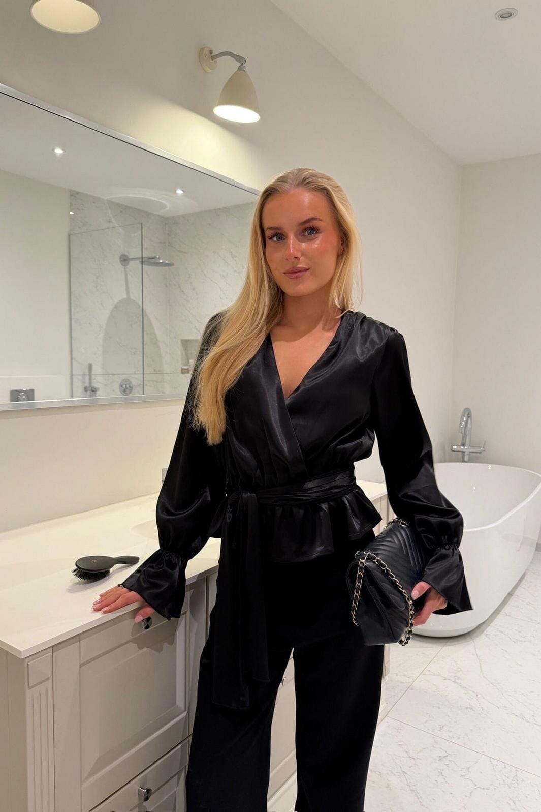 Zwarte satijnen blouse van BYIC met V-hals en strikband. De blouse heeft een losse pasvorm met een gemarkeerde taille en puffmouwen met elastische manchetten.