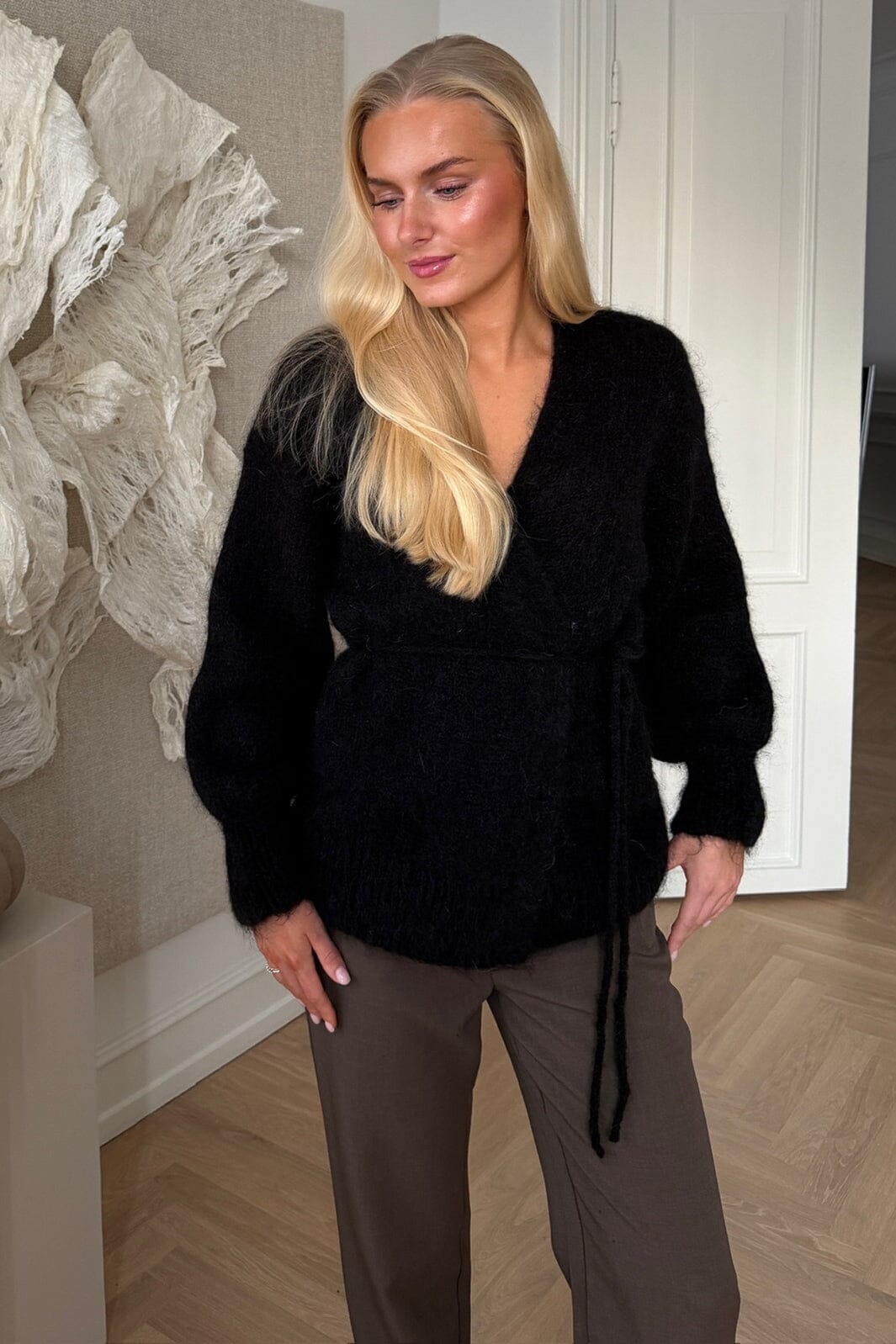 Zwarte wikkelcardigan van BYIC, gemaakt van een mengsel met 40 % mohair en 10 % wol. Het materiaal zorgt voor een zachte en warme gevoel met een fluffy oppervlak.