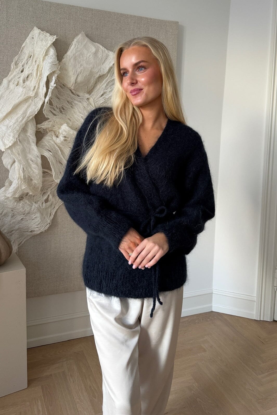 Donkerblau wikkelcardigan van BYIC met fluffy textuur. De cardigan heeft een diepe V-hals en een riem in de taille.