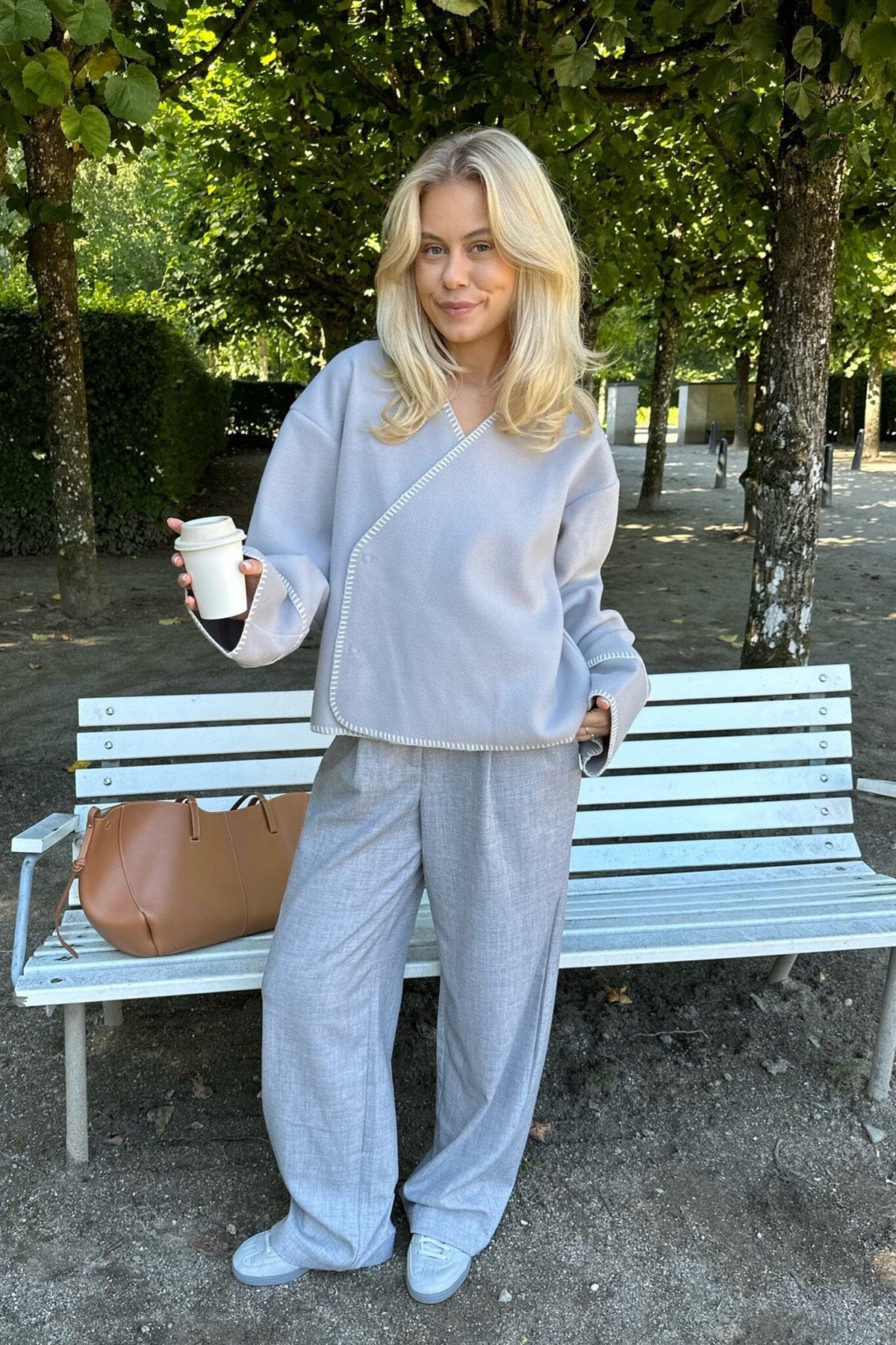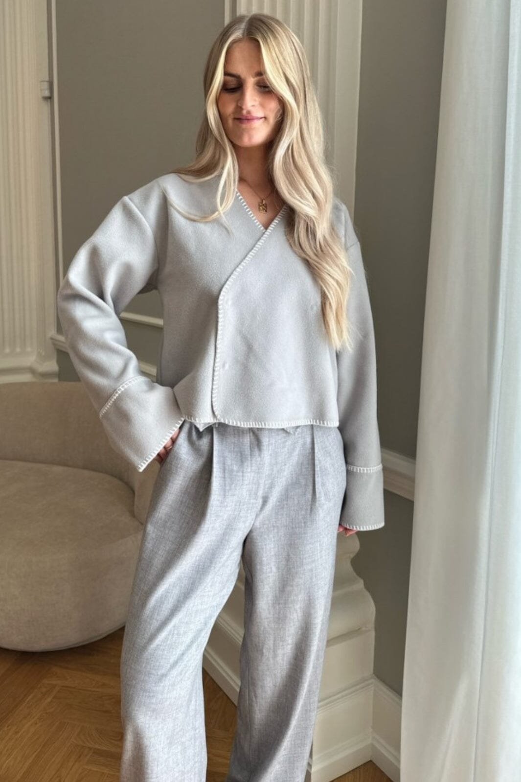 Grijze jas van BYIC met witte contraststiksels langs de randen. De V-hals en losse pasvorm maken het gemakkelijk om te stylen met verschillende lagen eronder. De brede mouwen bieden veel bewegingsvrijheid.