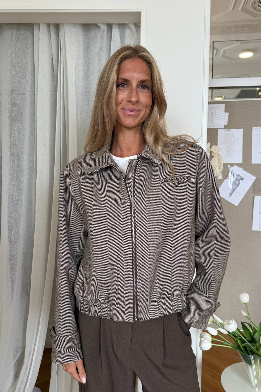 Korte jas van BYIC met bruin herringbone-patroon. De jas heeft een hoge kraag die kan worden omgeslagen en een elastische taille met een licht gepofte silhouet.