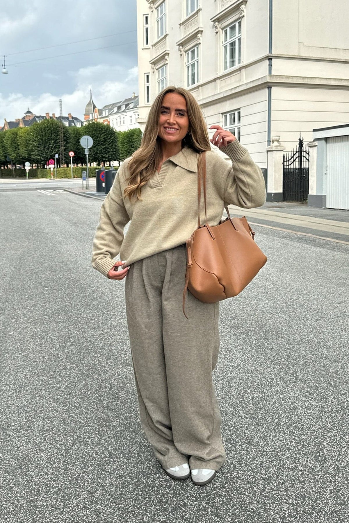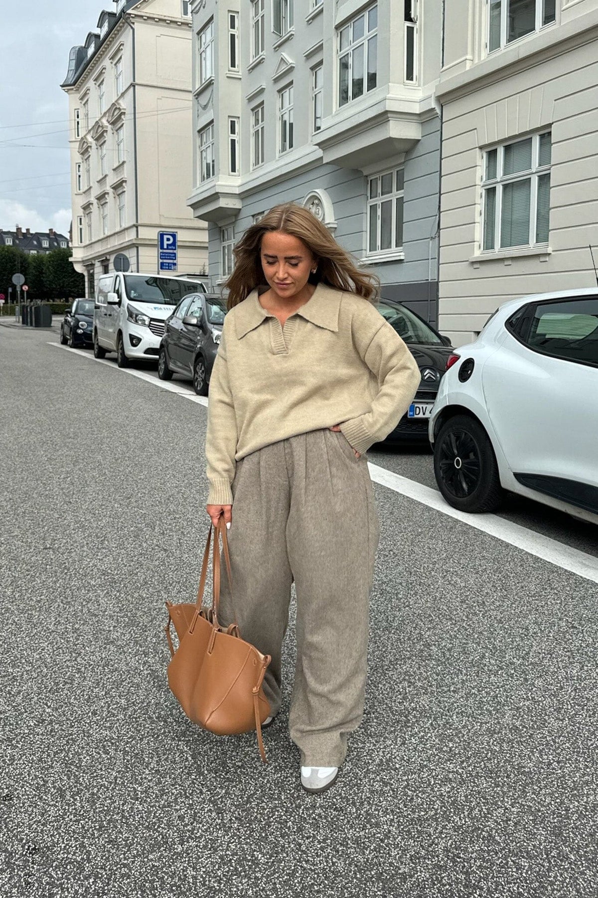 Beige poloshirt van BYIC met gebreide textuur. Het heeft een klassieke polokraag en lange mouwen.
