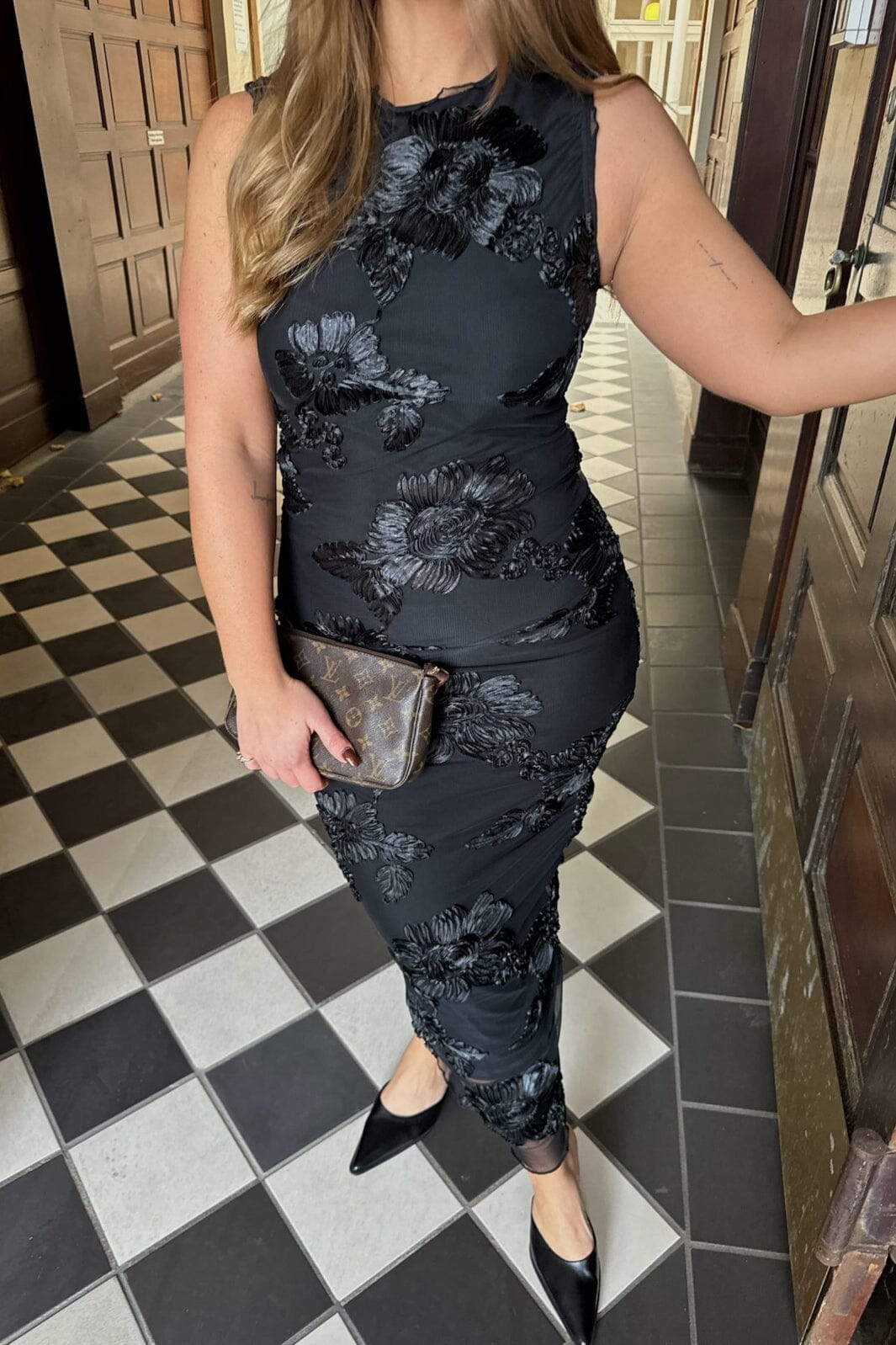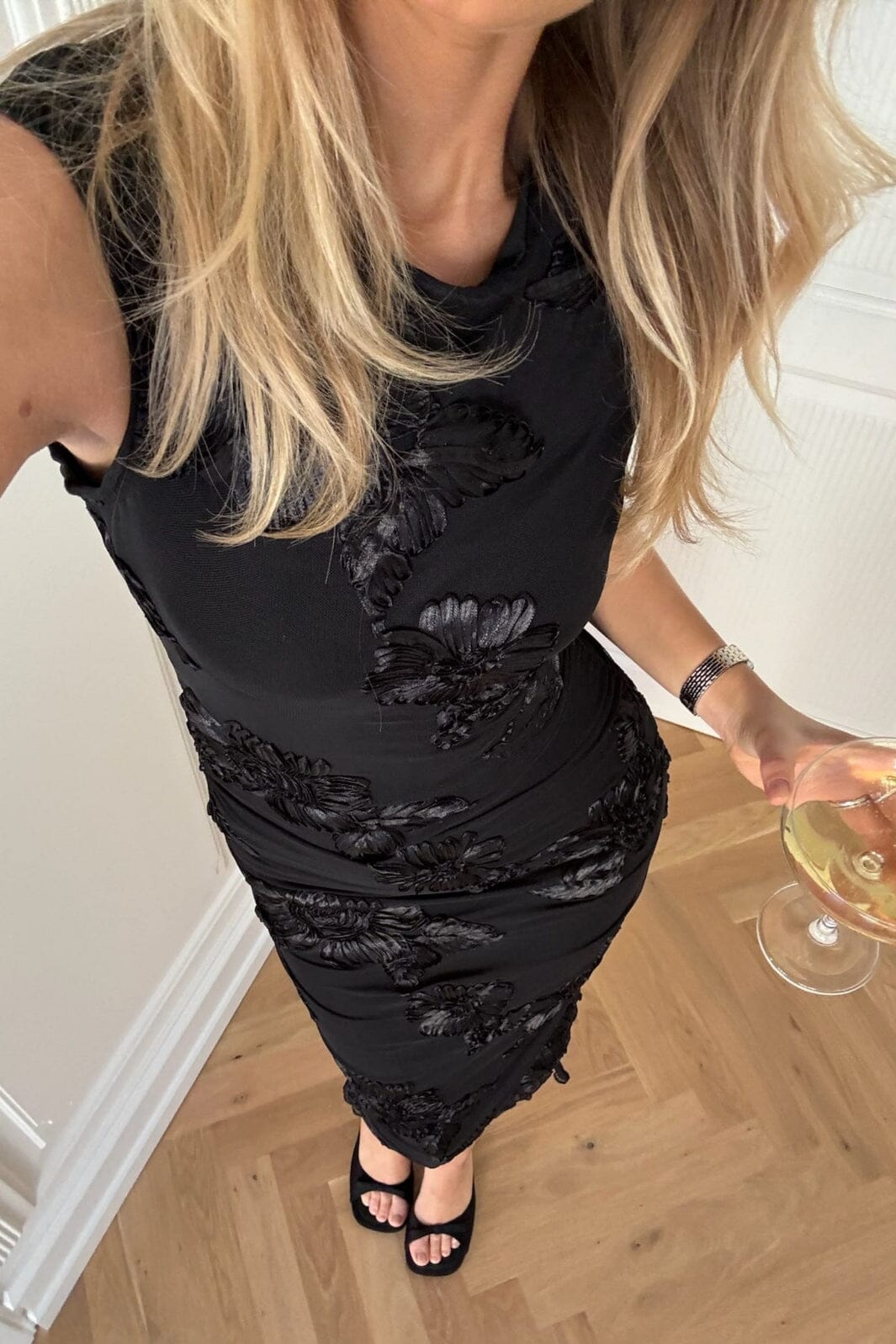 Zwarte mesh jurk met geborduurde bloemen van BYIC. De jurk heeft een aansluitende silhoët en komt tot halverwege de kuit. De ronde halslijn en het mouwloze ontwerp geven een strakke uitstraling.